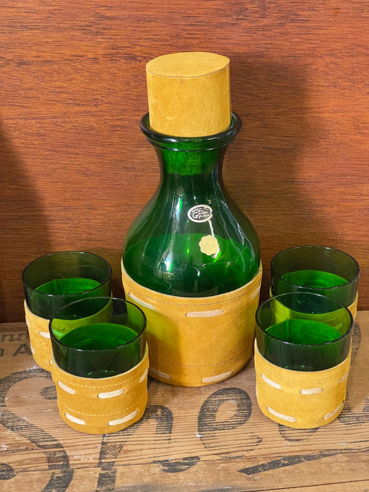 1960s Italian Green Glass Decanter & Four Tumblers with Suede Holders