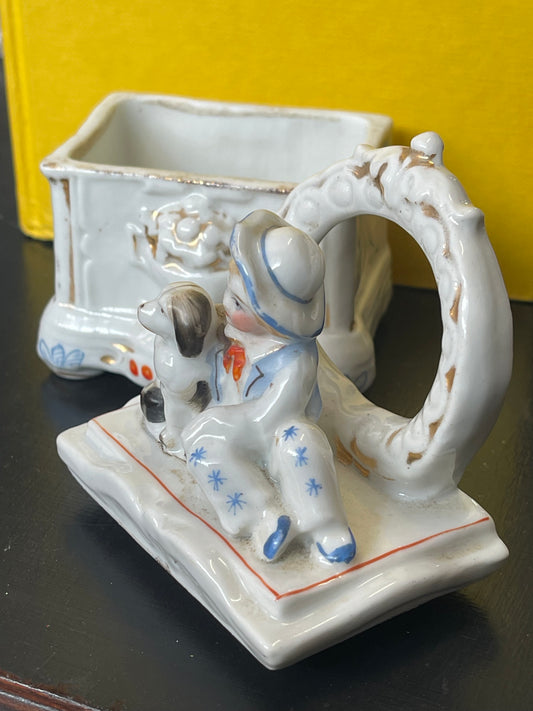 Antique Victorian Conta & Boehme Fairing Trinket Box – “Boy Hugging Dog”