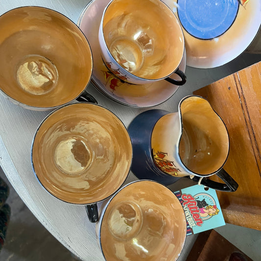 C.1930s Japanese Lustreware tea cups for four with sailing ships