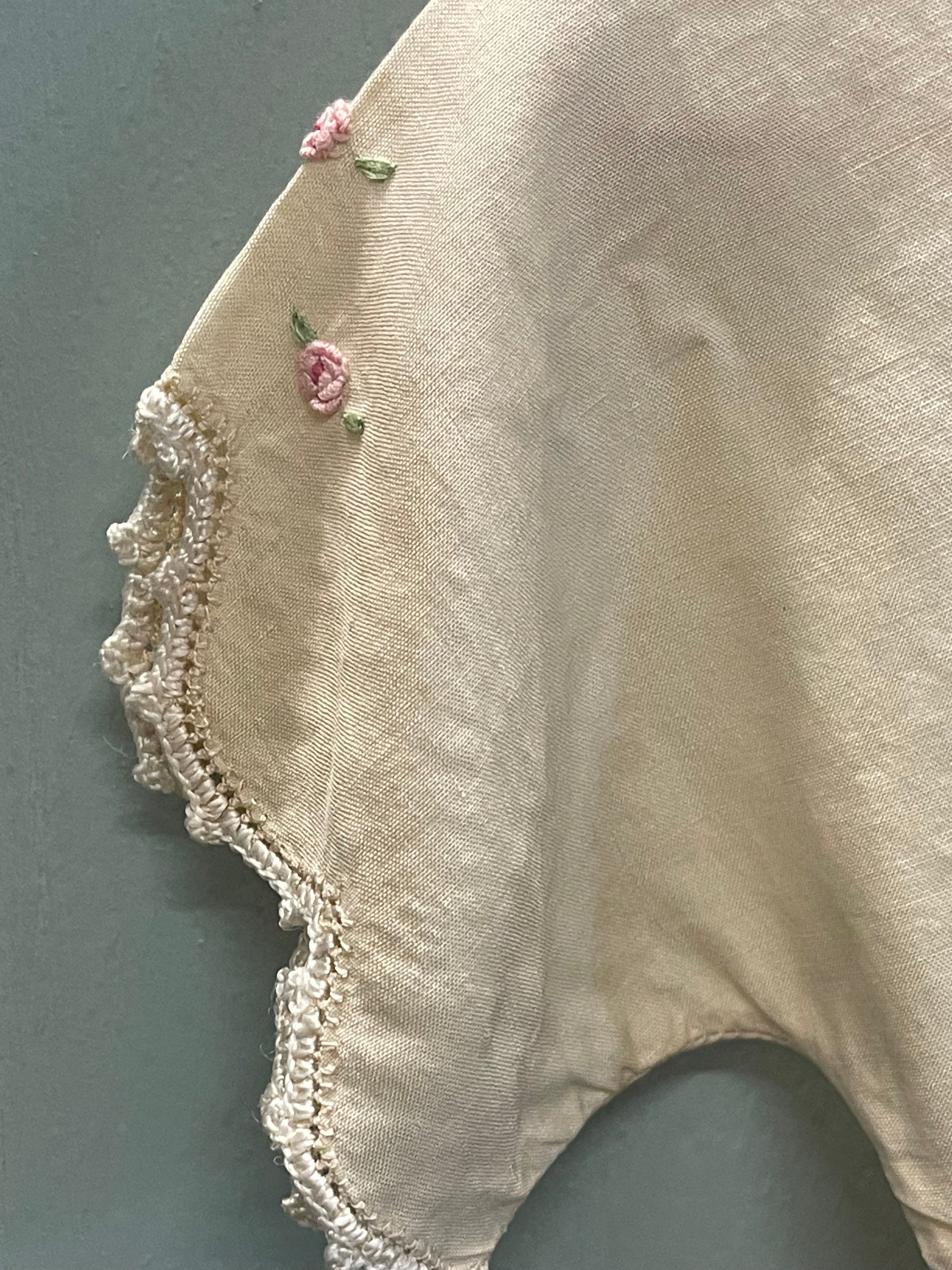 A rare heirloom of early baby wear — this 1930s hand-embroidered baby dress is entirely hand-finished, from its French seams to its dainty scalloped lace edges. Made from creamy soft rayon-satin, it’s embroidered with tiny pink rosebuds along the hem, sleeves, and yoke. Every stitch speaks of patience and care.