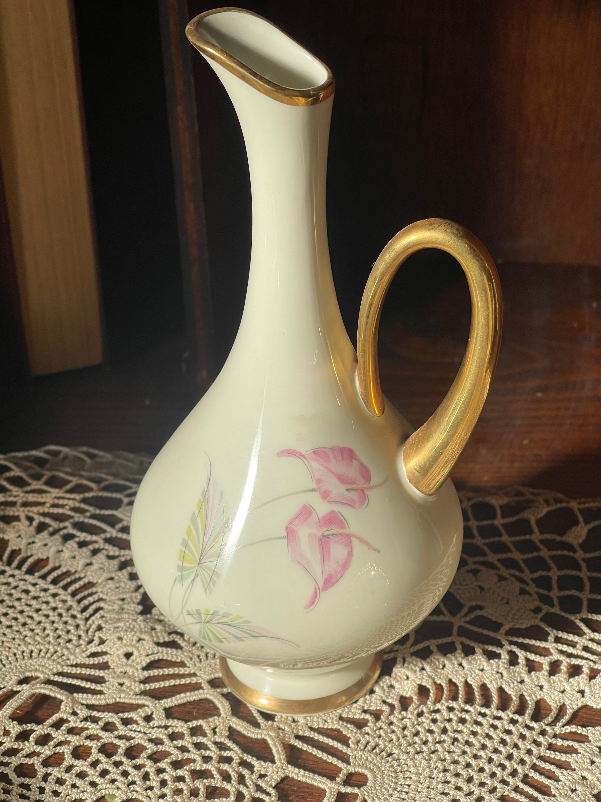 Soft pink calla lilies scroll around the creamy porcelain body, paired with a show-stopping gilt handle and trim — classic 1950s femininity with just the right touch of glamour.