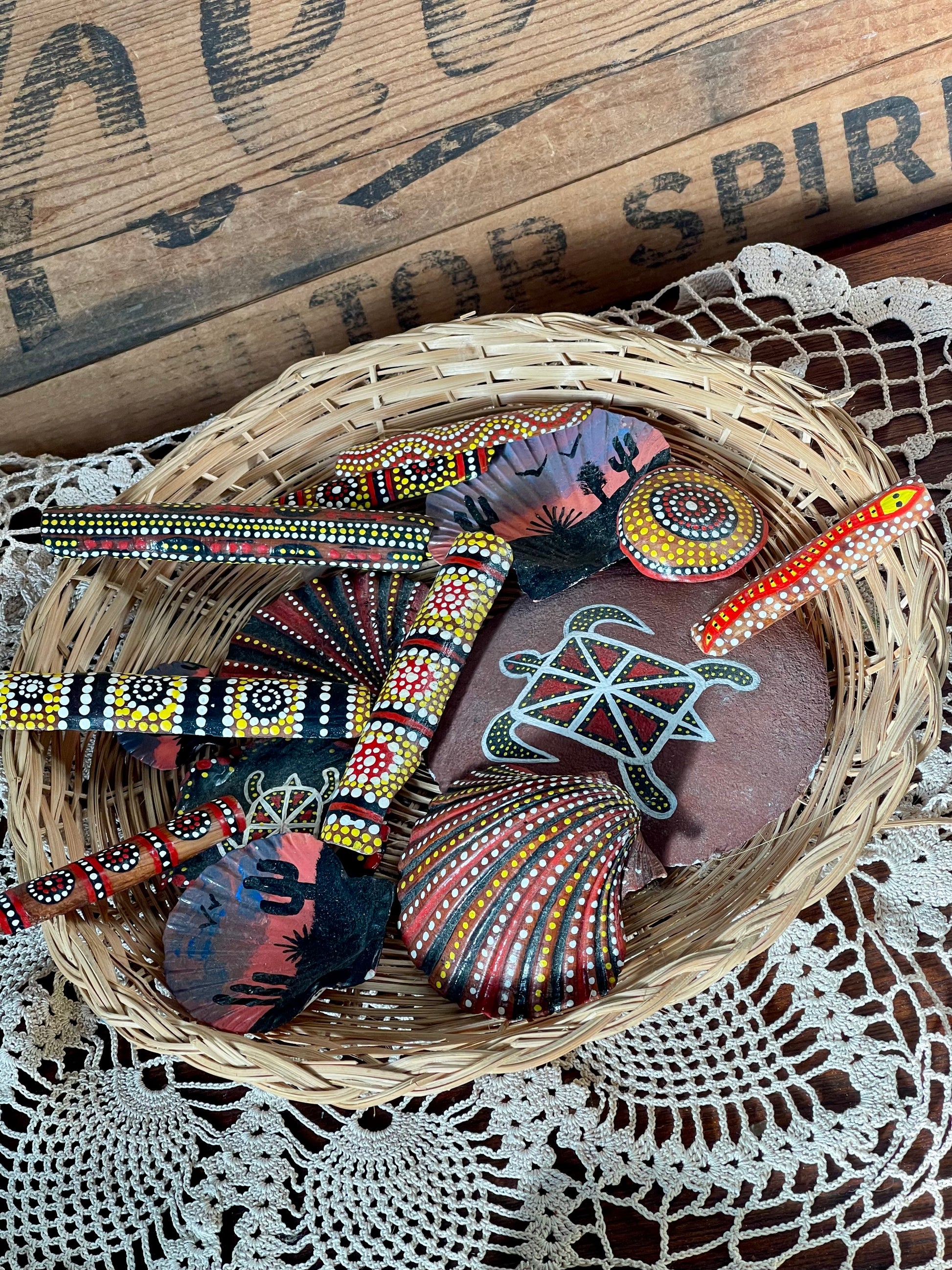 A charming basket of hand-painted souvenir shells, stones pieces decorated in the Aboriginal-inspired dot art style. These colourful pieces were commonly sold through tourist stops and gift shops across Australia as keepsakes and decorative tokens.