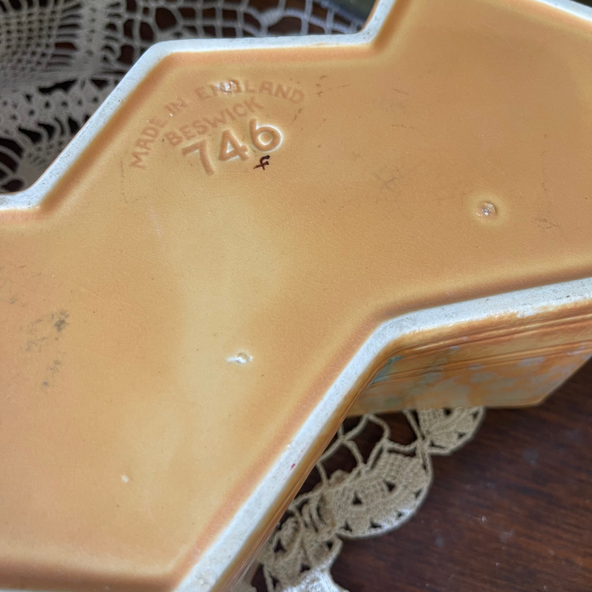 A striking zig-zag vase by Beswick, England — Shape 746 — designed in the late 1930s to early 1940s, during the transition from Art Deco to mid-century styling. Its bold stepped silhouette and angular geometry are classic Art Deco features, while the soft satin apricot glaze with lichen mottling hints at the gentler tones of post-war ceramics.