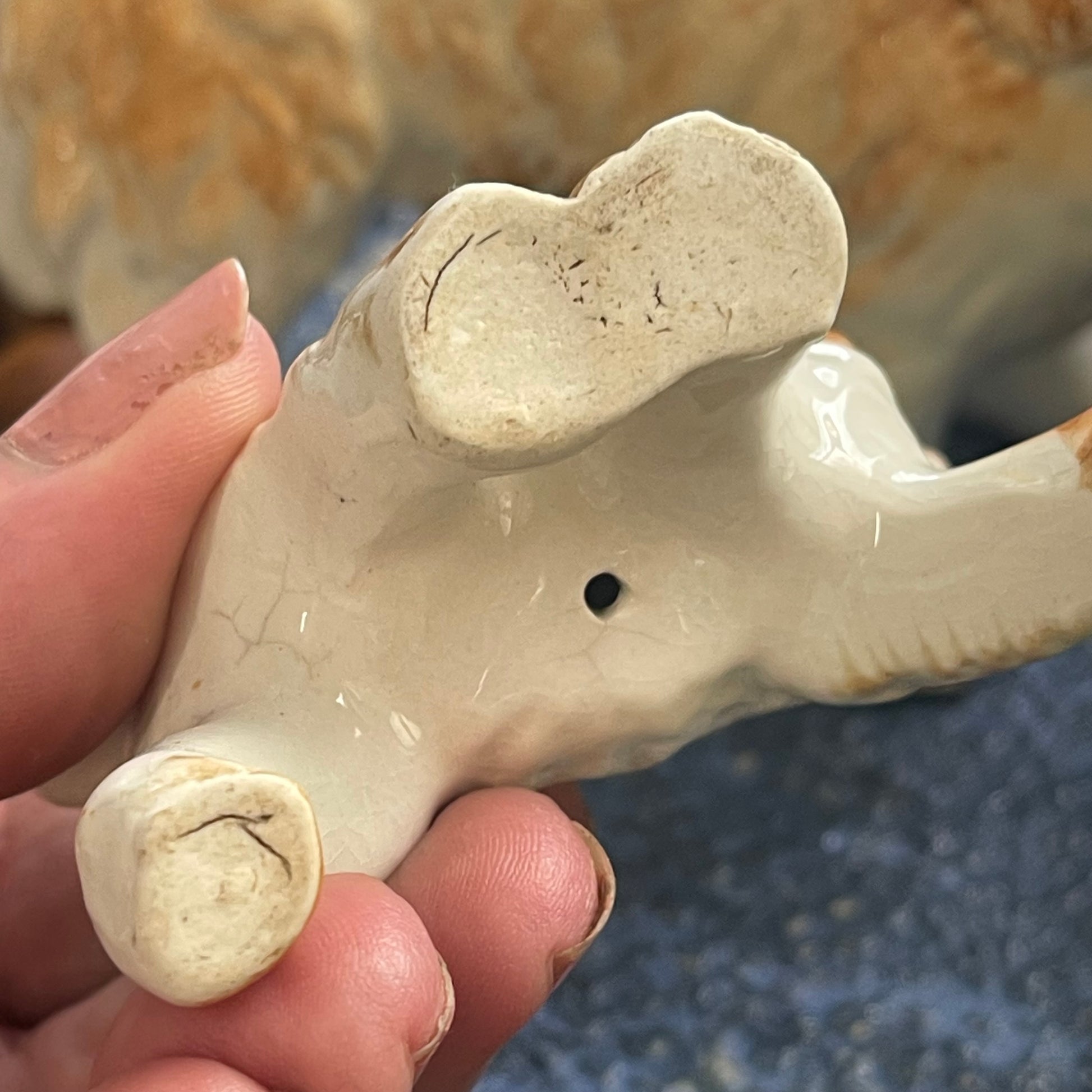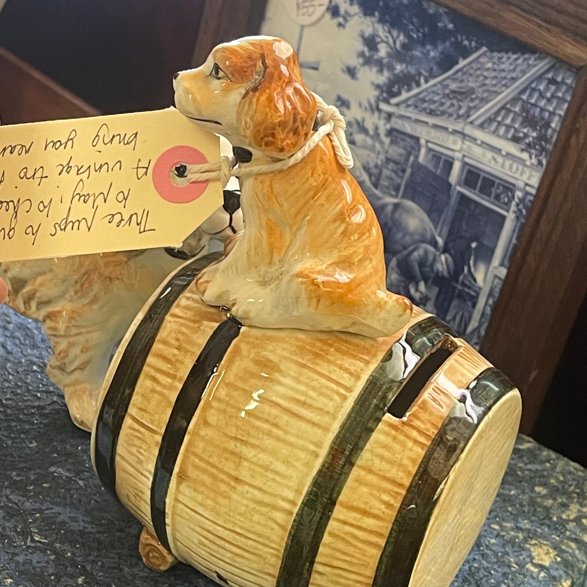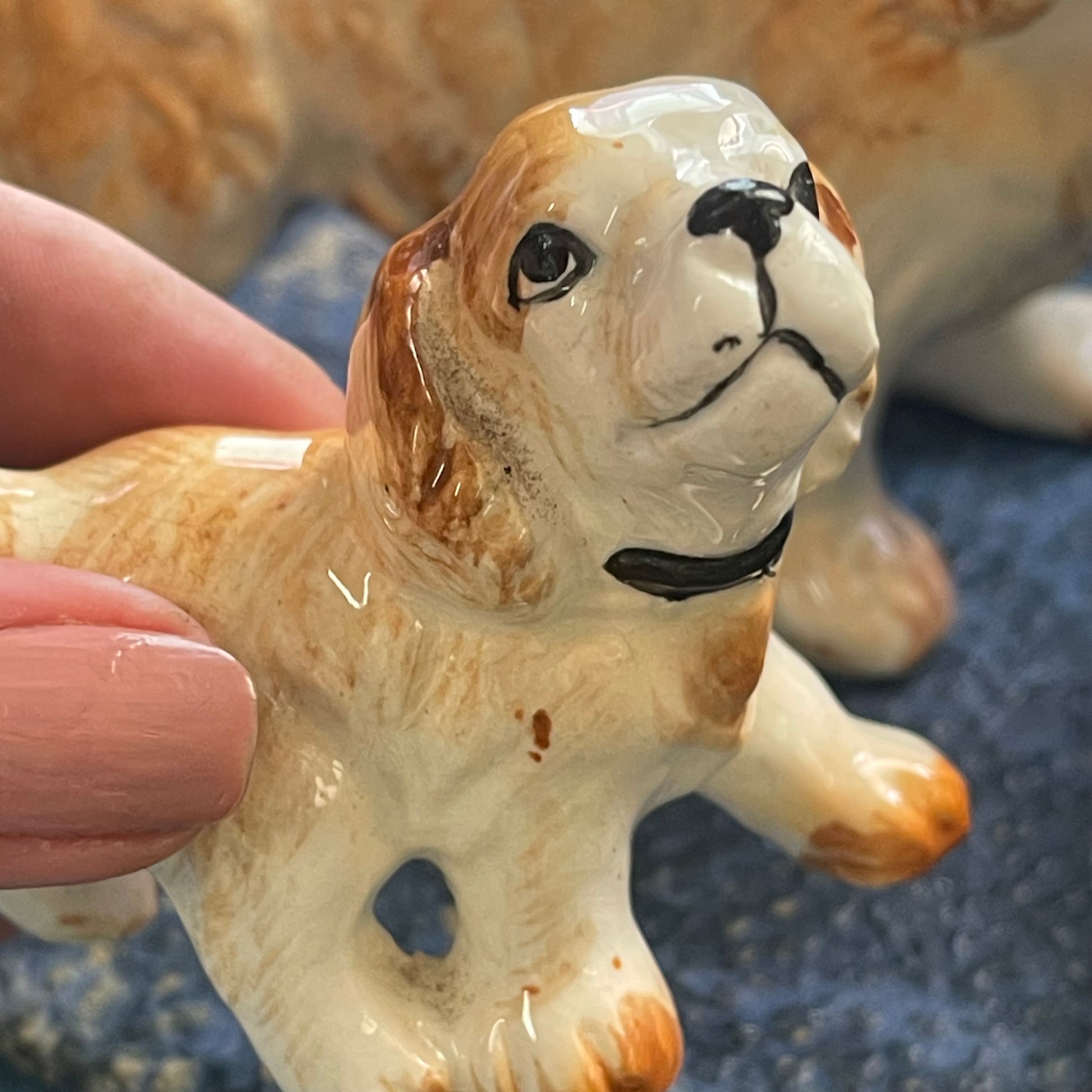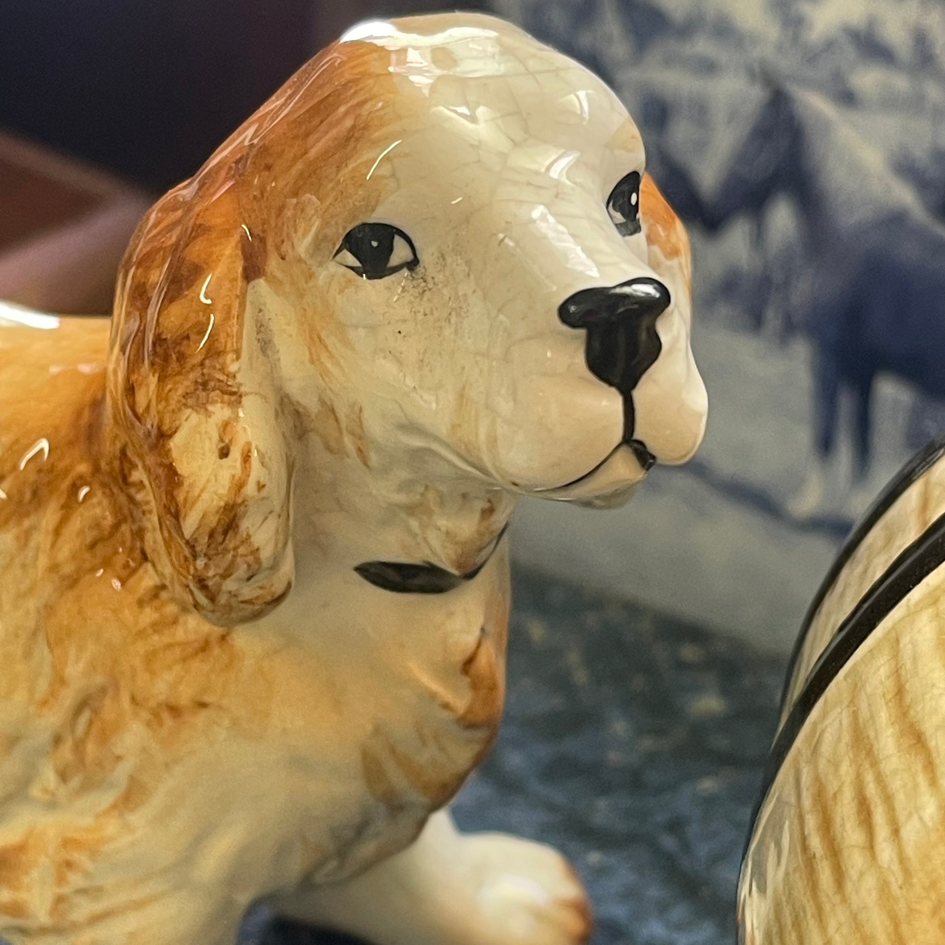Charming trio of vintage ceramic spaniels, including two standing dogs and one perched atop a “Beware of the Dog” barrel money box.