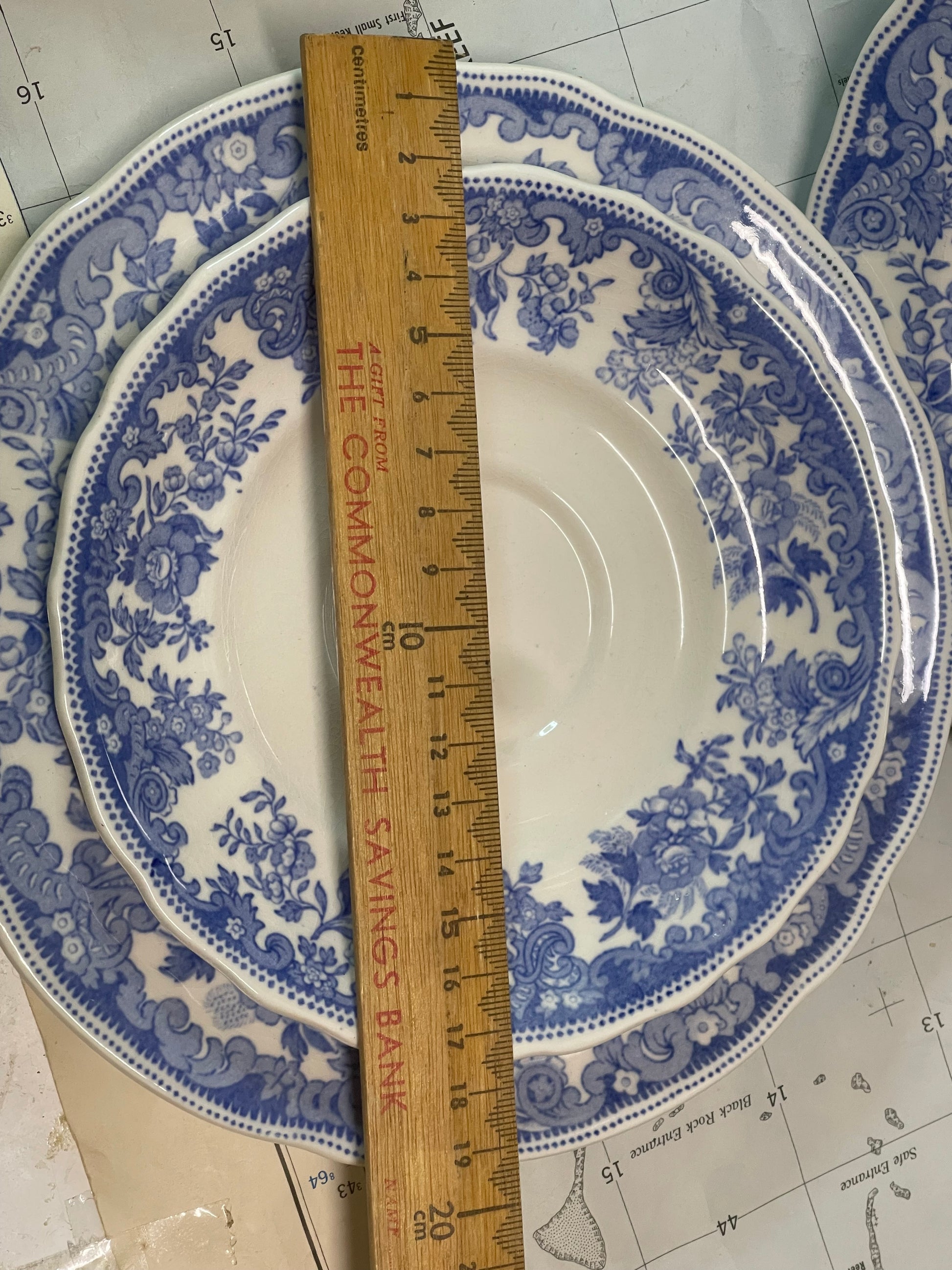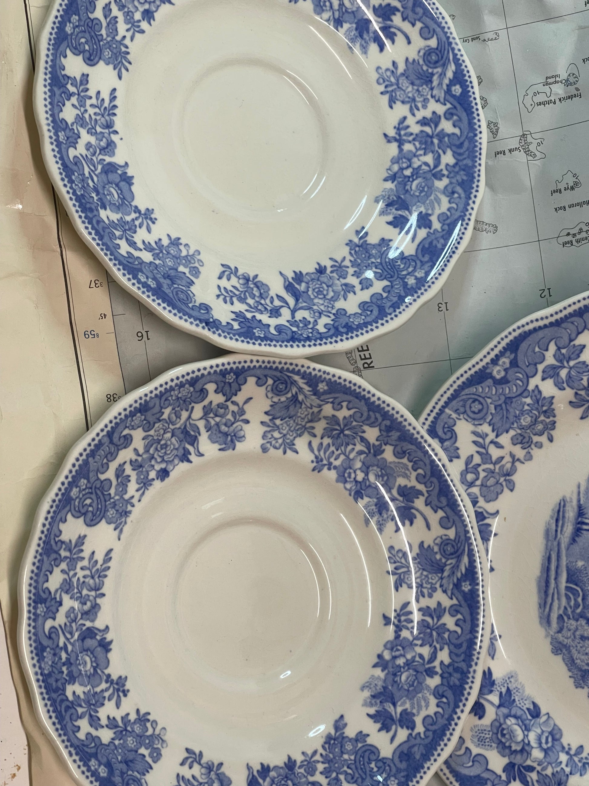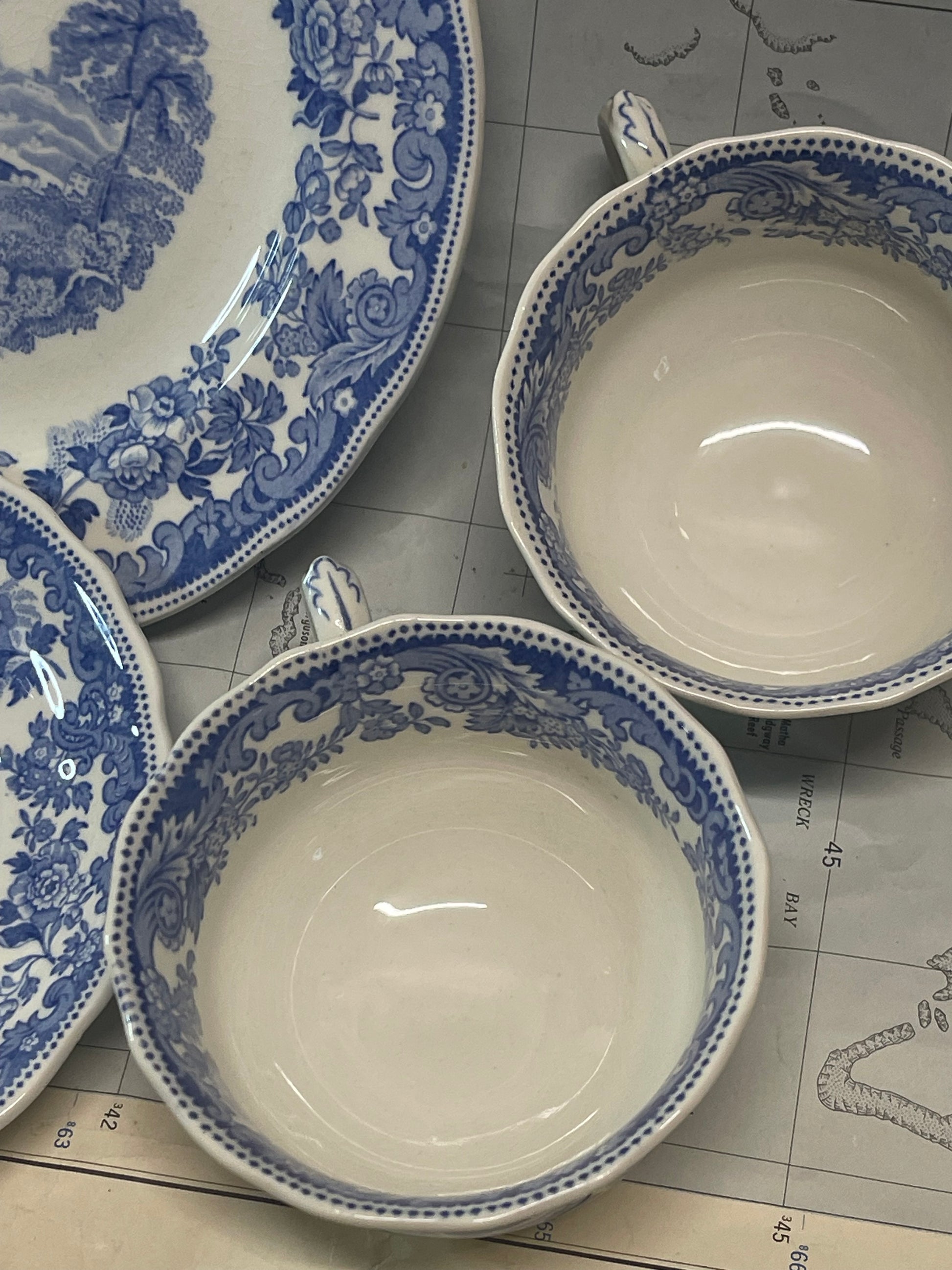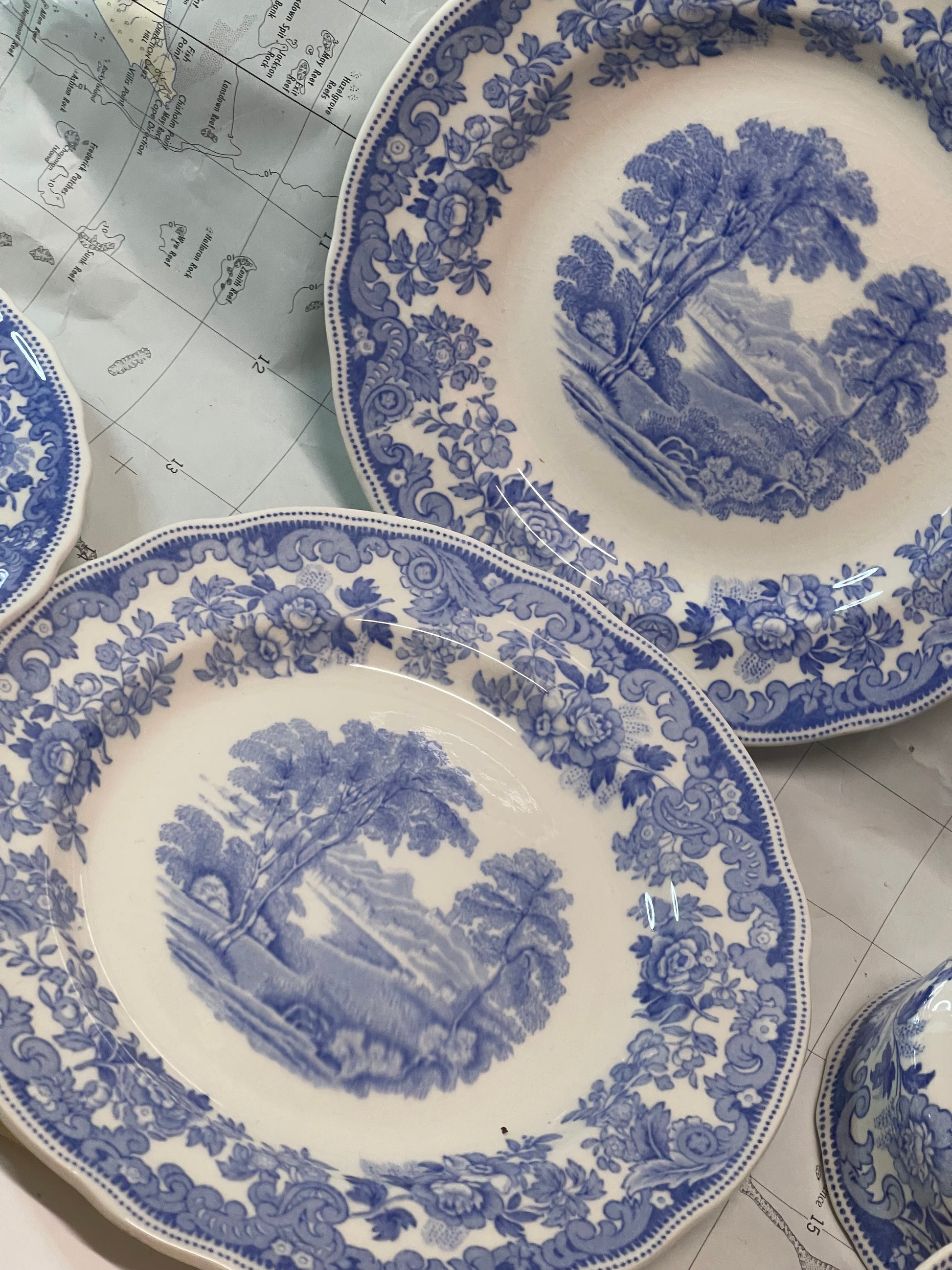 Rich cobalt blue florals frame a romantic pastoral landscape centre — a design deeply rooted in the English transferware tradition. The scalloped edges and delicate shaping give these pieces that soft, slightly romantic turn-of-the-century feel.
