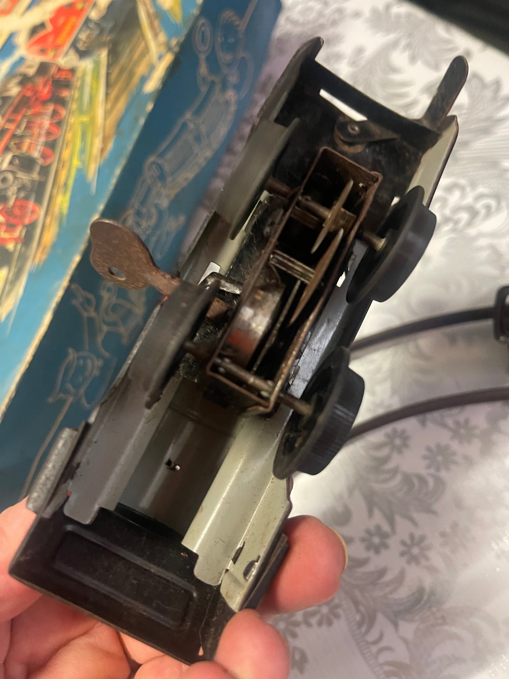 The engine still winds and runs beautifully (a tiny miracle for its age!), though the carriages have lost their wheels over time and now make excellent display pieces. The box shows age and wear but remains wonderfully graphic — perfect for styling in a vintage children’s room, toy shelf, or railway-themed nook.