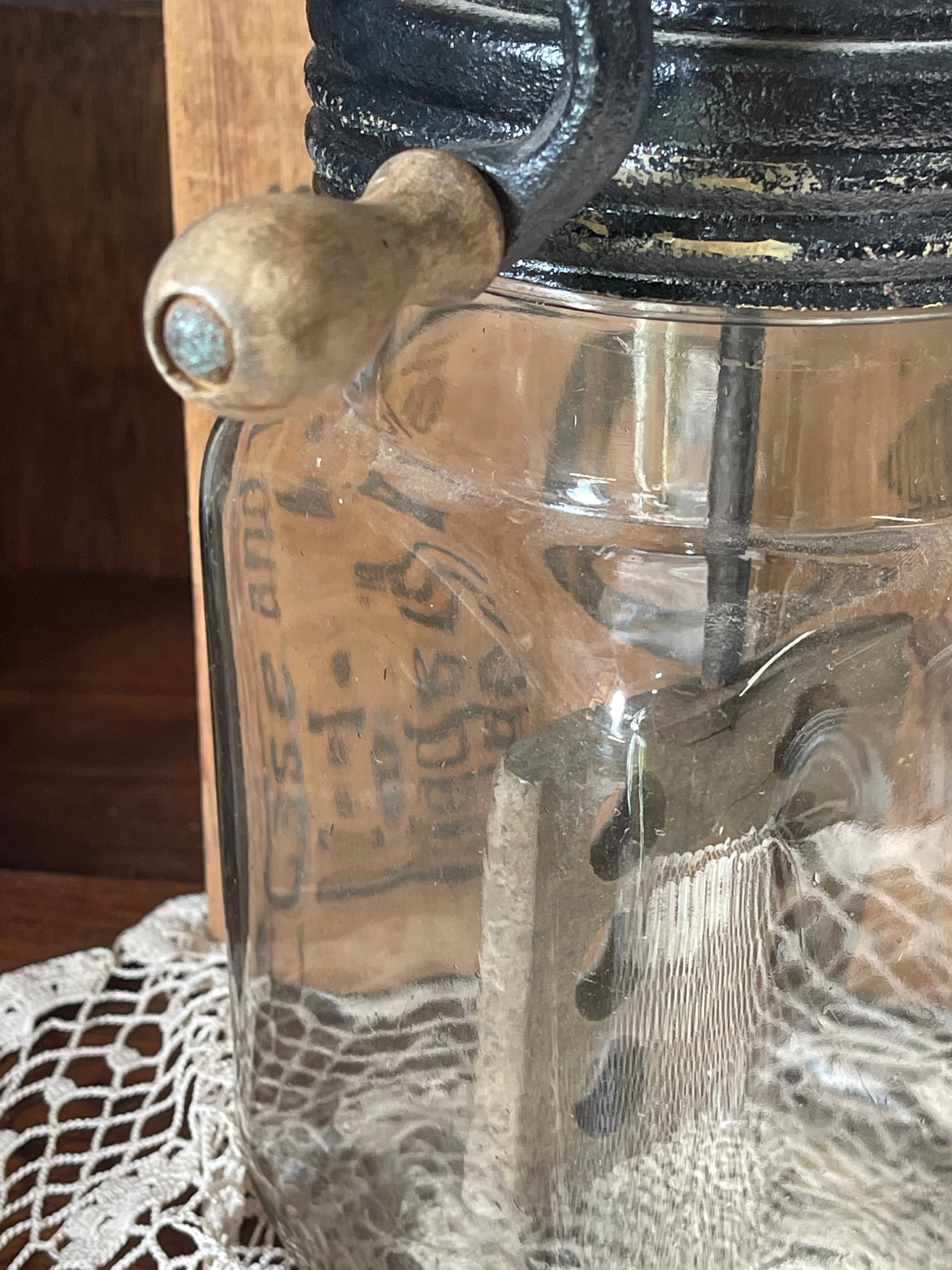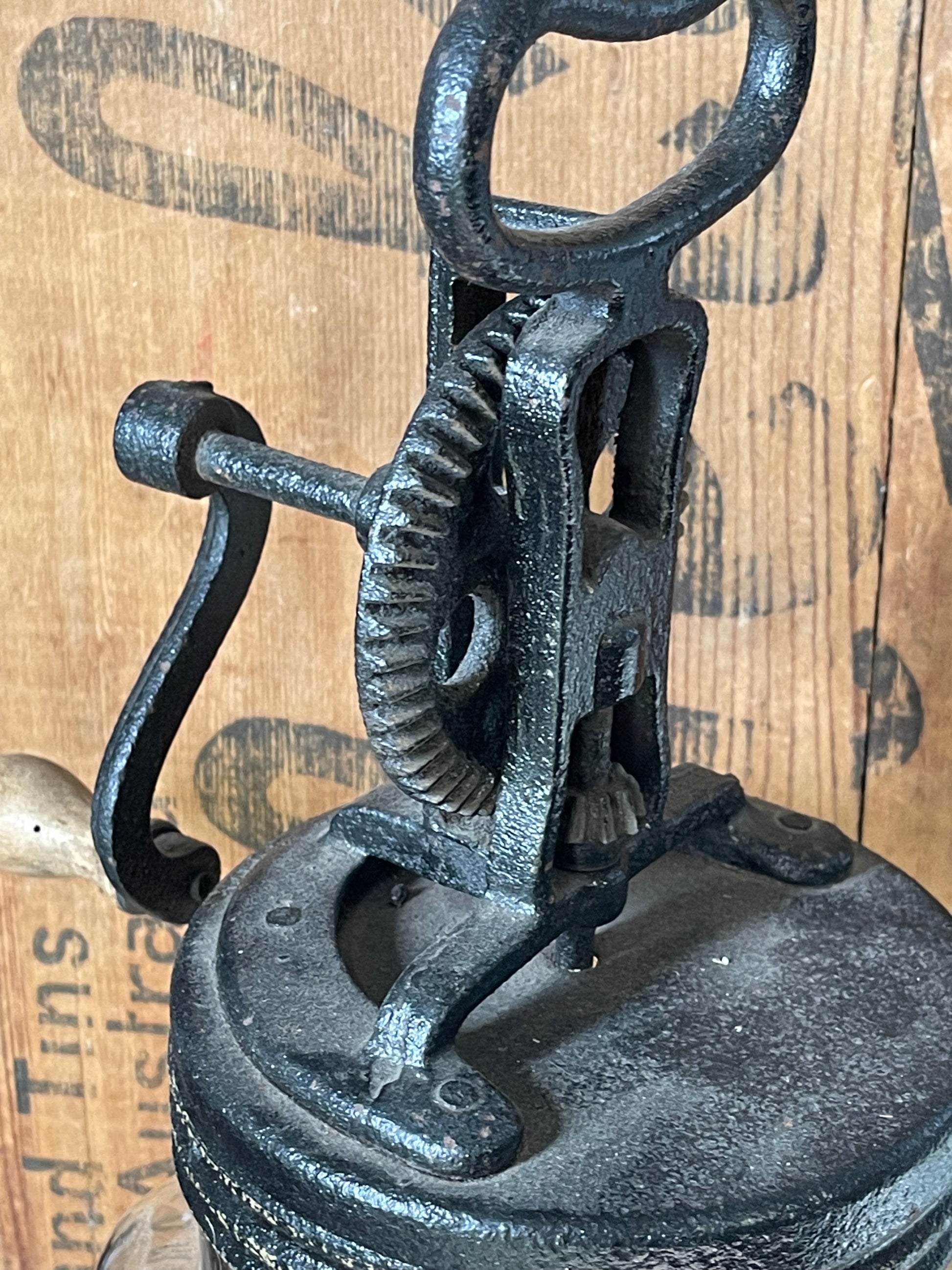 Before electric mixers and store-bought blocks, butter was a slow craft — turned by hand and made in rhythm with the home. This early 1900s cast-iron butter churn is a beautiful example of farmhouse ingenuity, sitting over a heavy square glass jar with its original timber paddle still intact.