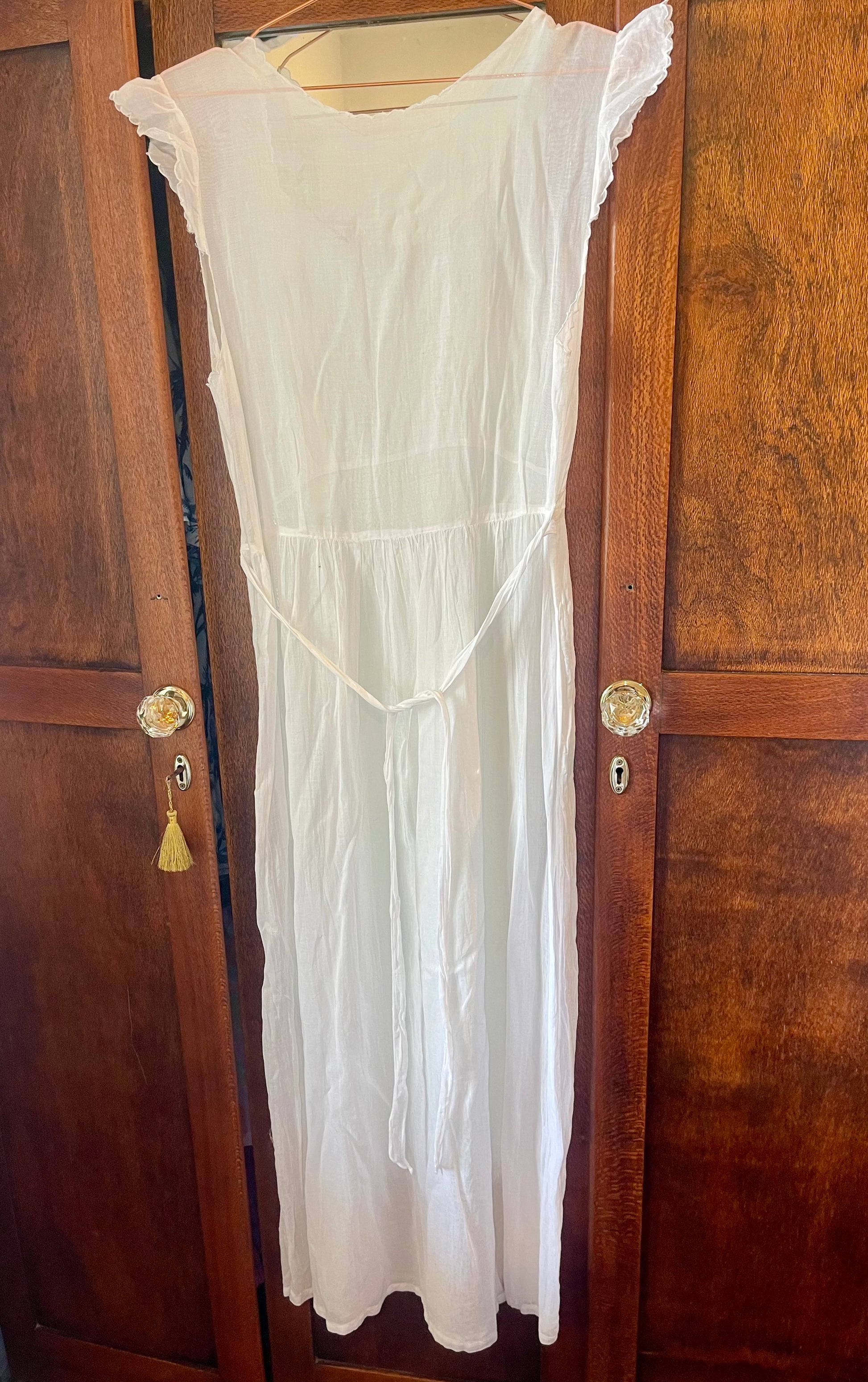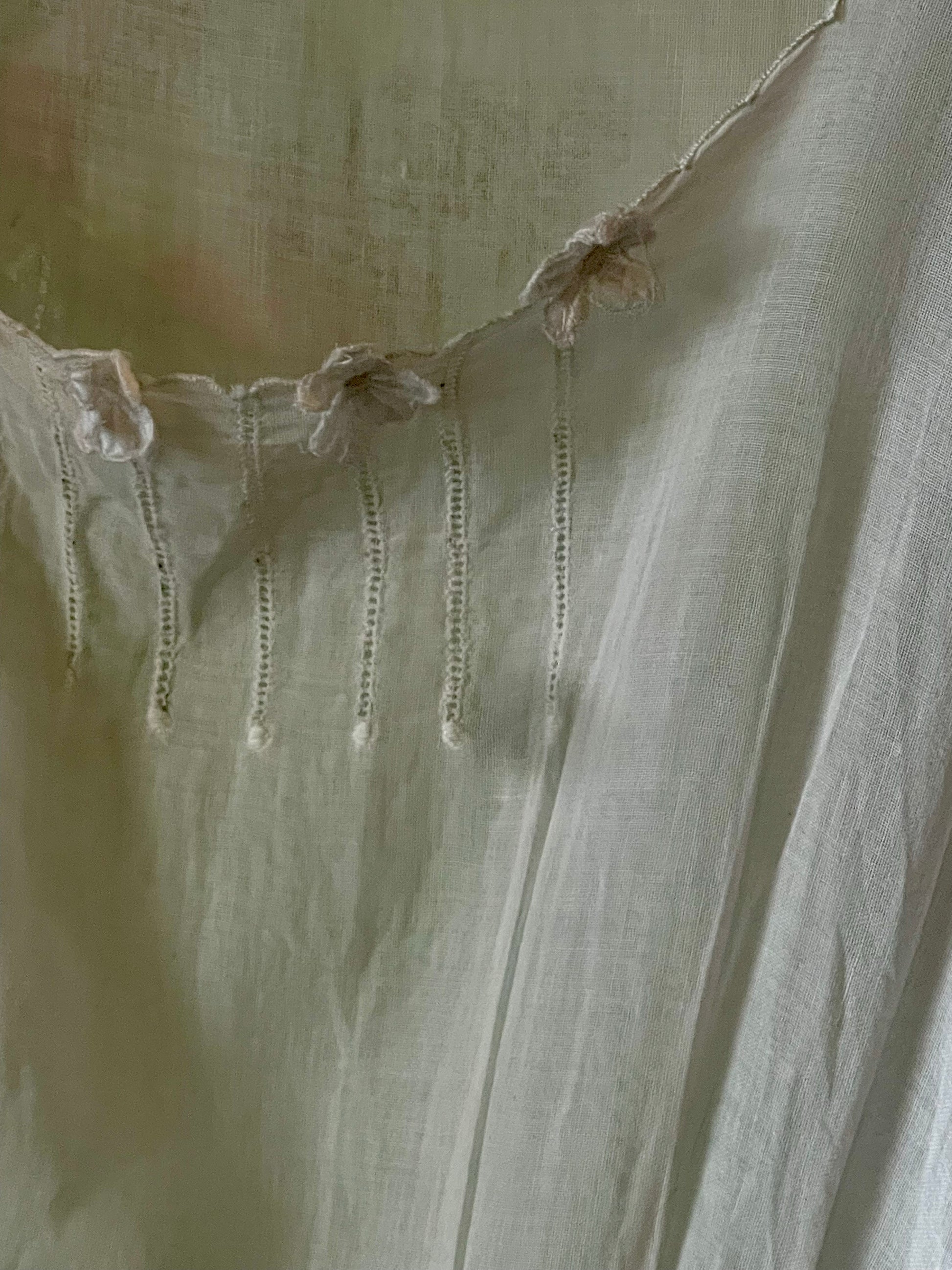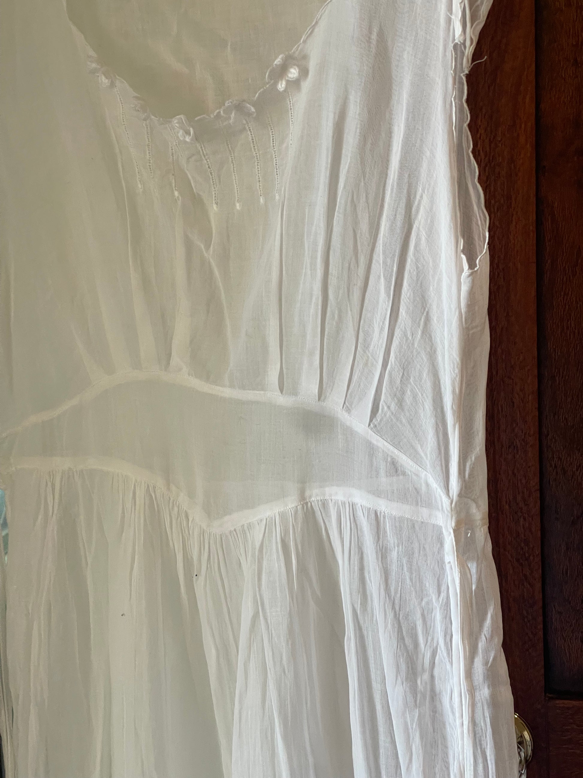 Likely worn as a summer or boudoir dress in the early 1900s, its flowing cut and fine workmanship speak of quiet grace and long-forgotten mornings.