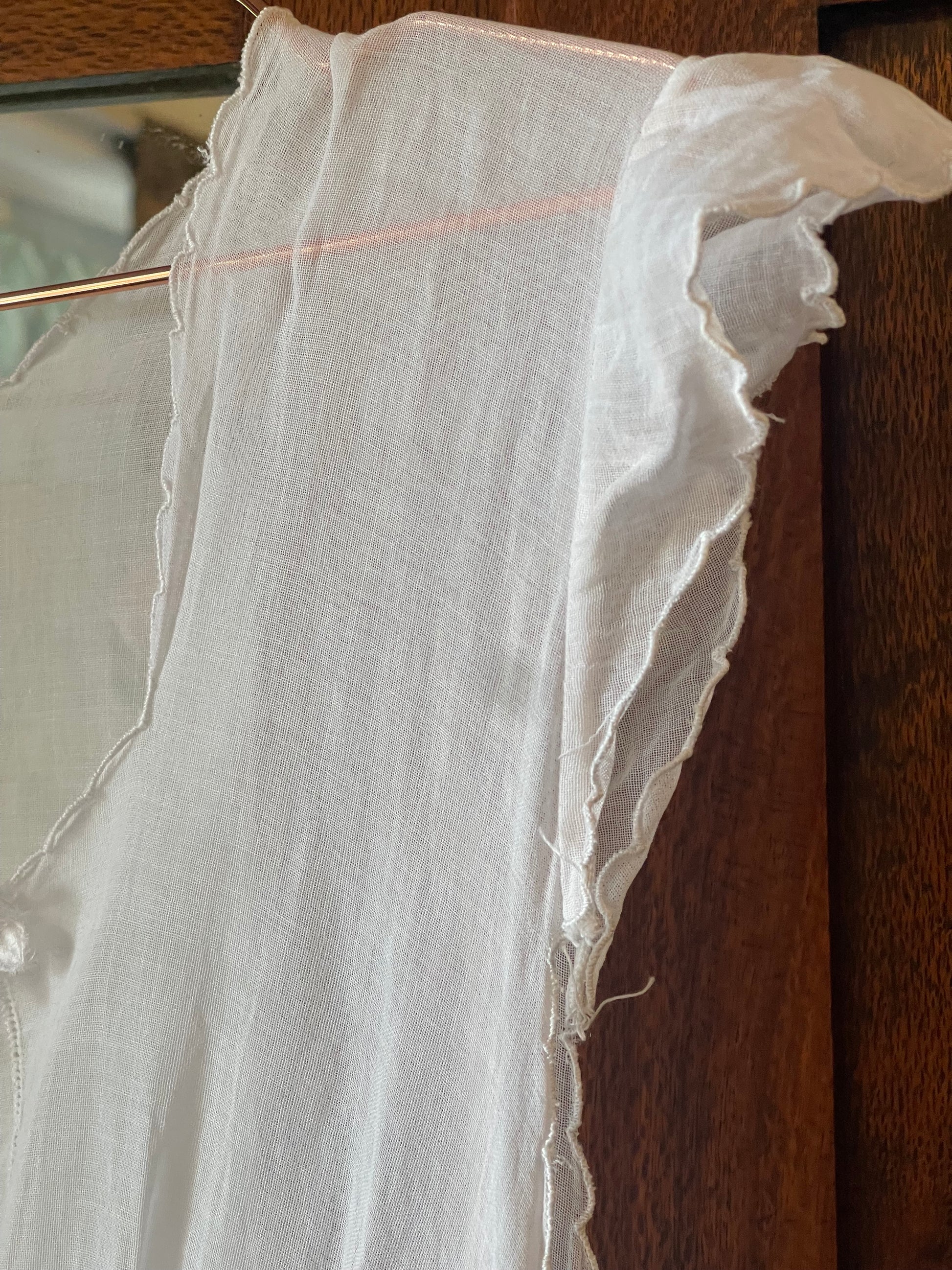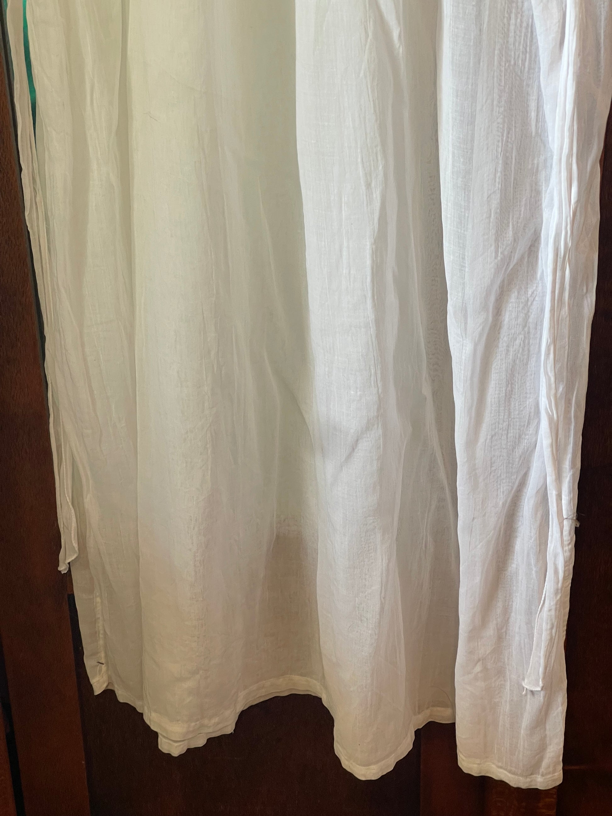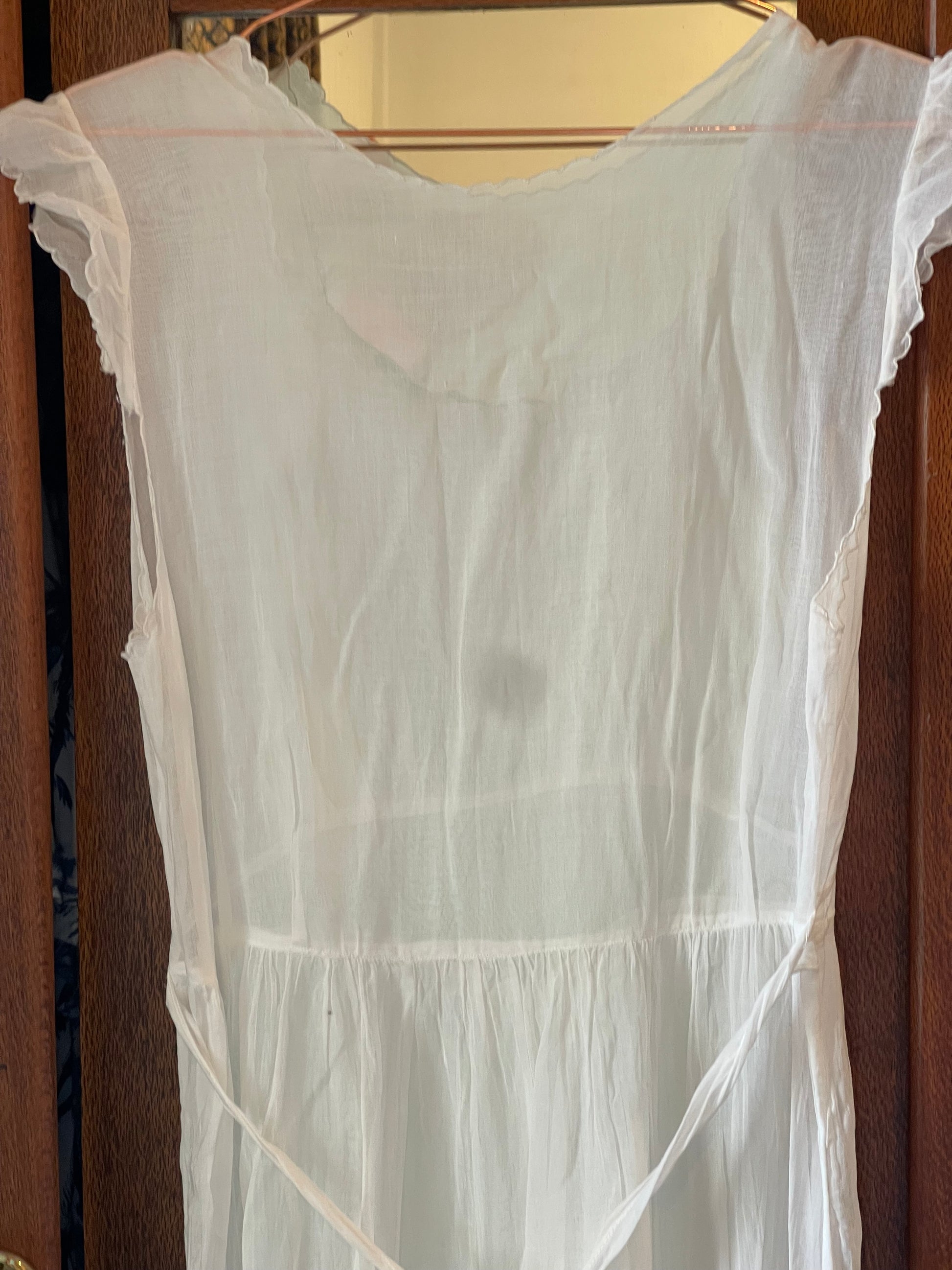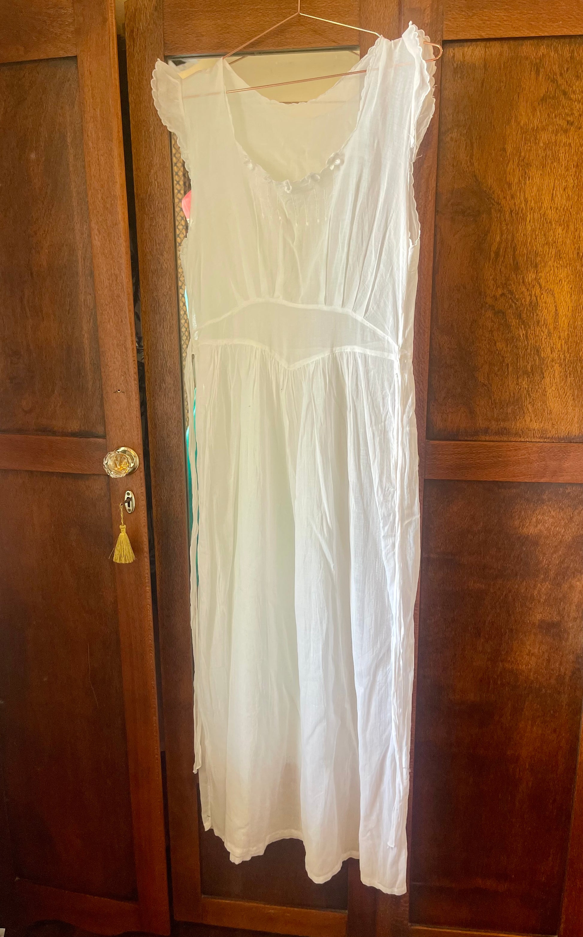 Likely worn as a summer or boudoir dress in the early 1900s, its flowing cut and fine workmanship speak of quiet grace and long-forgotten mornings.