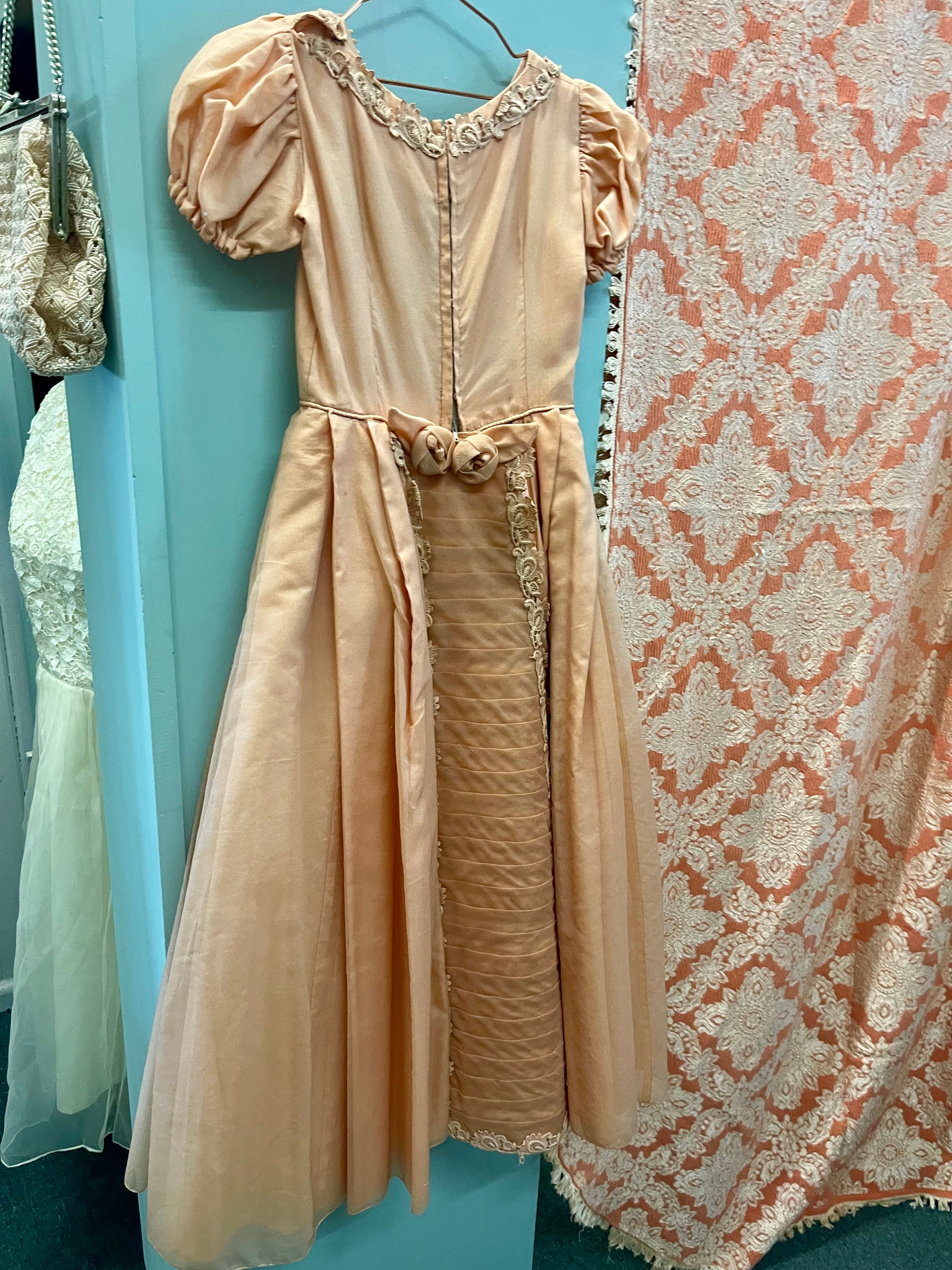Made right here in Mackay, this dress carries the spirit of local weddings and community halls — of satin ribbons, handmade rosettes, and proud mothers sewing by lamplight. The colour is soft and romantic, perfectly in tune with the era’s love of apricot tones and floral trims.