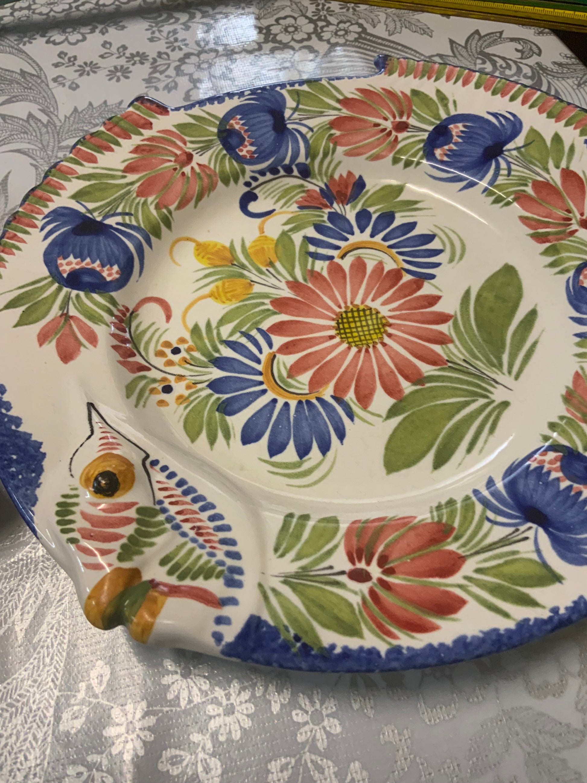 Brighten your table with these large hand-painted HB Quimper dinner plates in the shape of fish from Brittany, France. With their bold floral sprays in cobalt blue, coral red, green, and golden yellow, they’re as beautiful on the wall as they are on the table.
