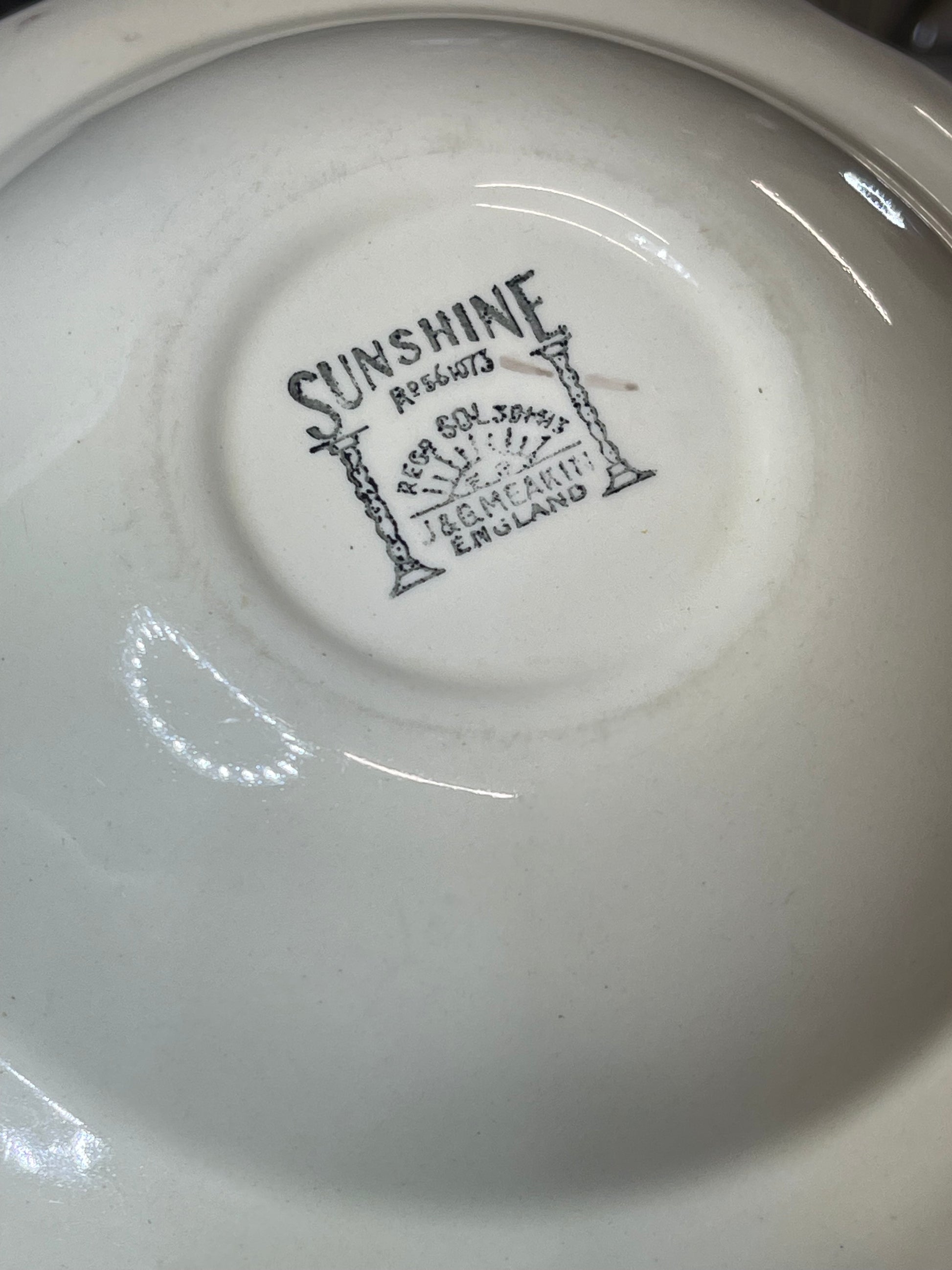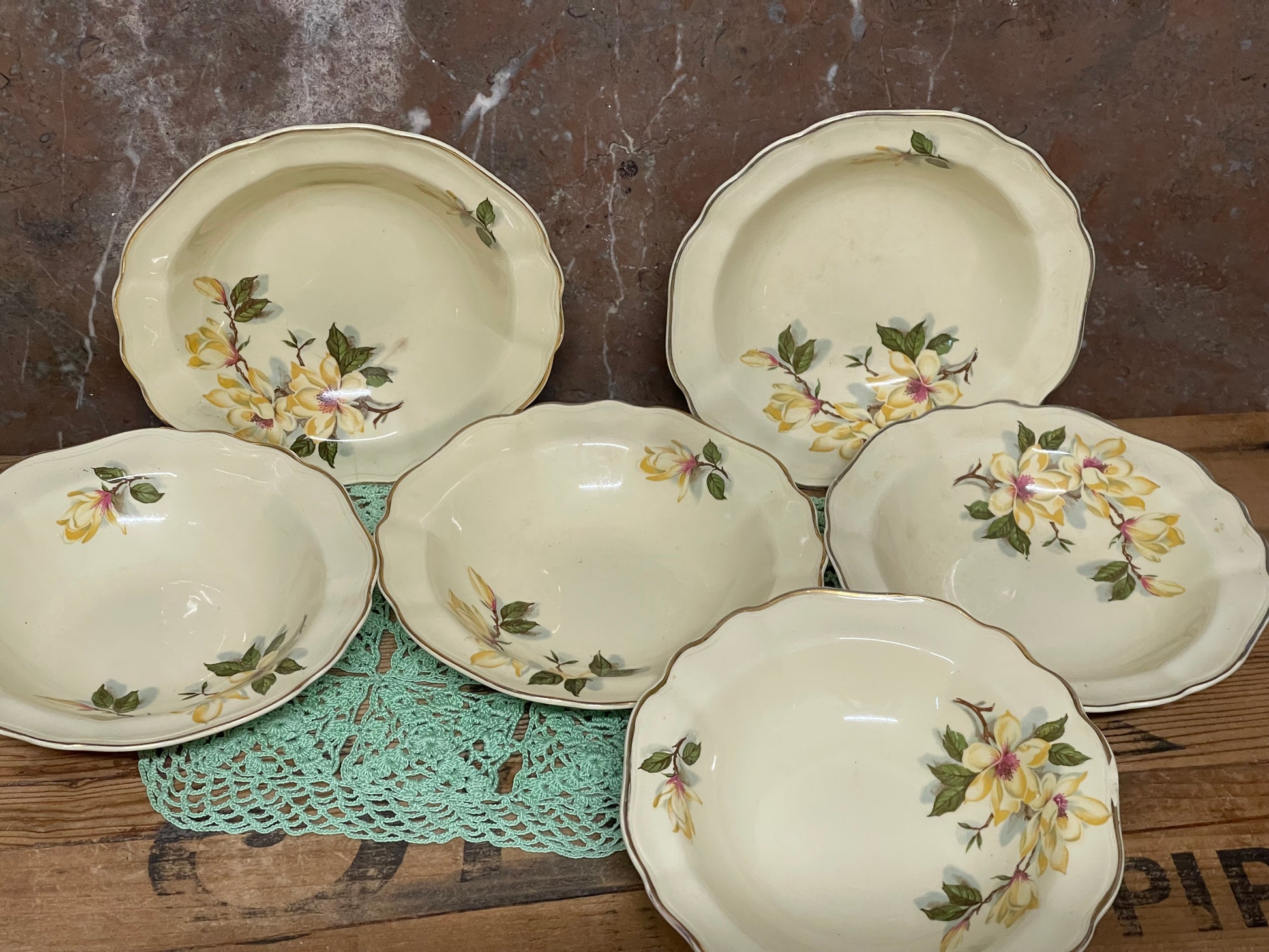 Brighten up your vintage table setting with this charming set of six dessert/soup bowls from J&G Meakin, England in the Sunshine range. Featuring soft yellow magnolia blossoms with green foliage and finished with a scalloped gold-rim edge, these bowls are a delightful example of 1940s–50s English pottery.