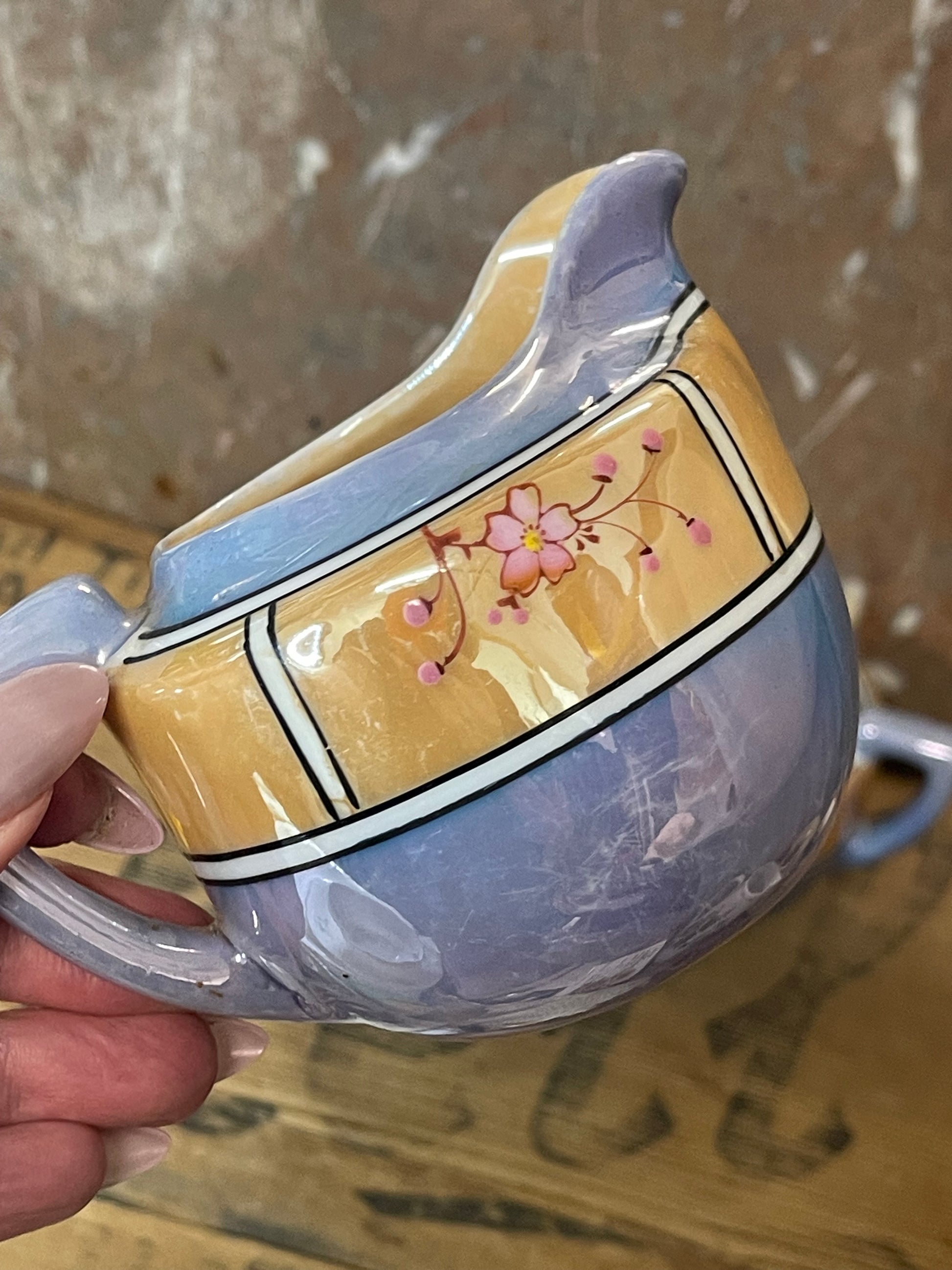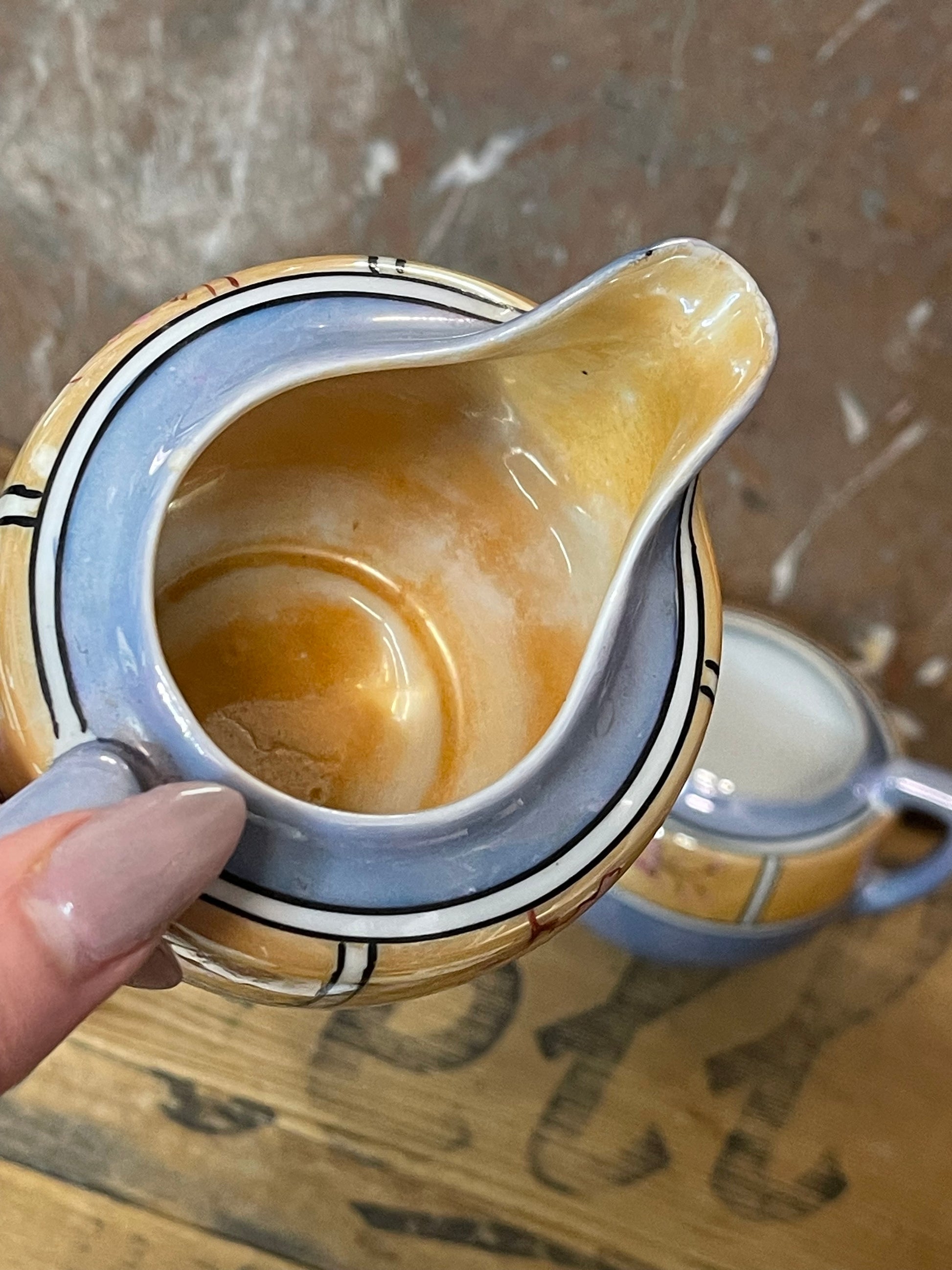 A charming Japanese lusterware cream and sugar set, dating from the 1920s–30s. This set features: