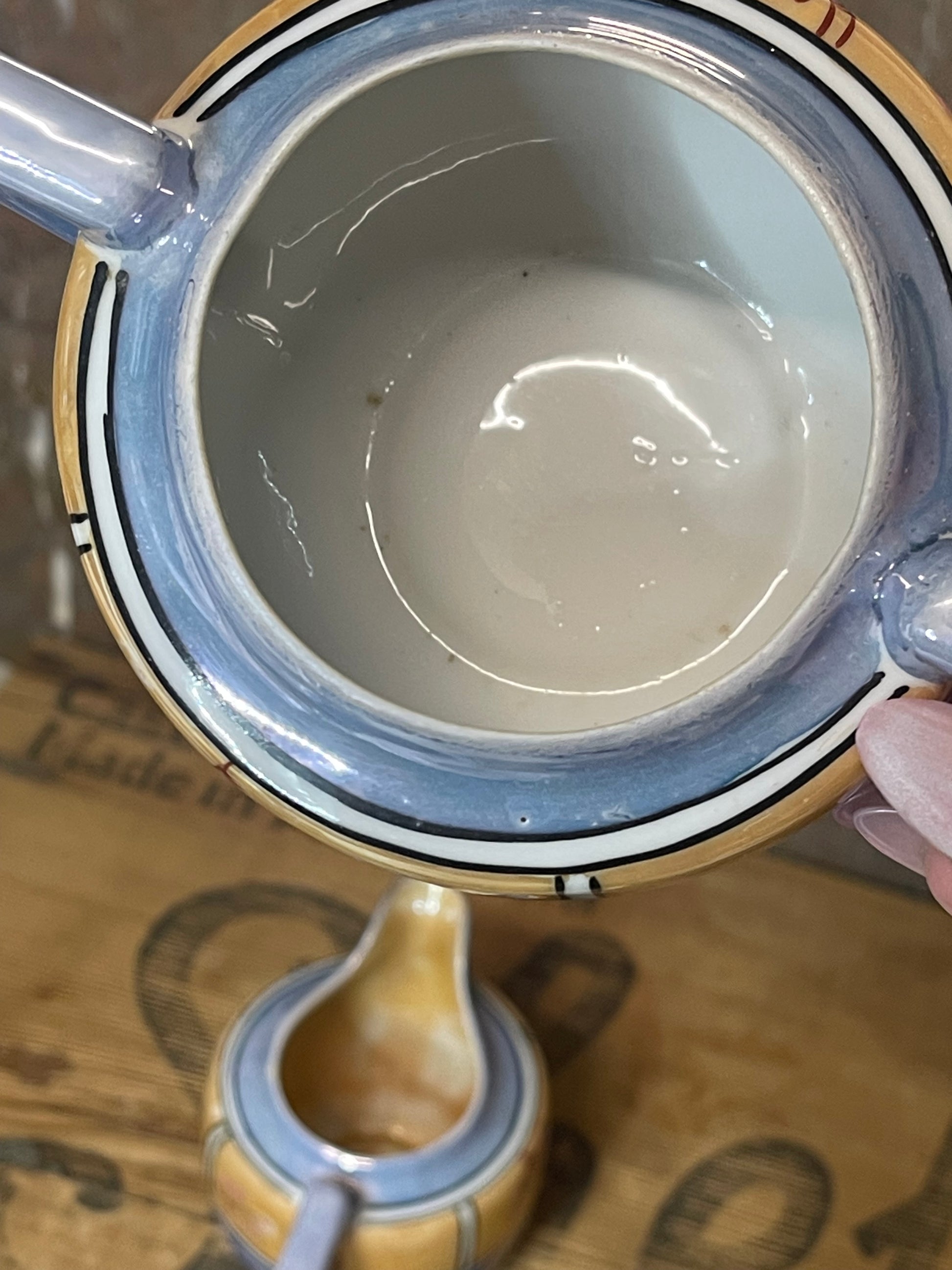 • Distinctive angular handles and rounded forms, typical of Art Deco-era Japanese export ware.