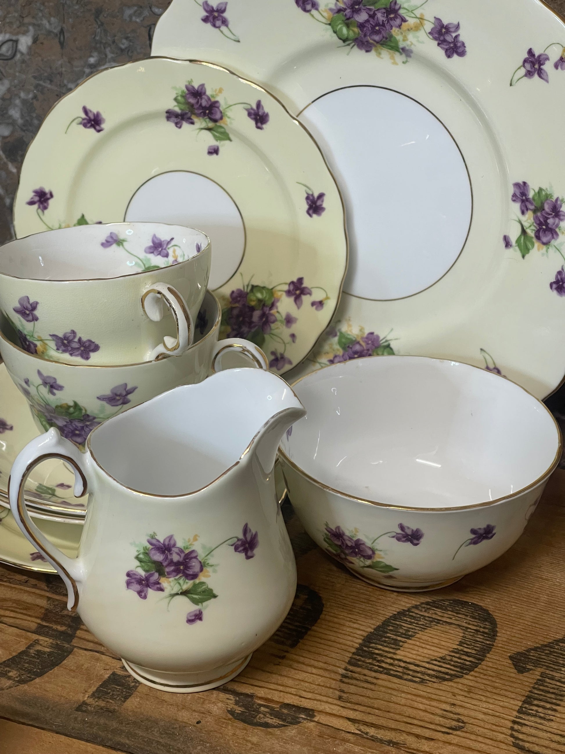 This set includes two complete trios (teacup, saucer, and side plate) plus a matching milk jug and open sugar bowl. Perfect for afternoon tea with a friend or for adding to an existing Melba violet collection.