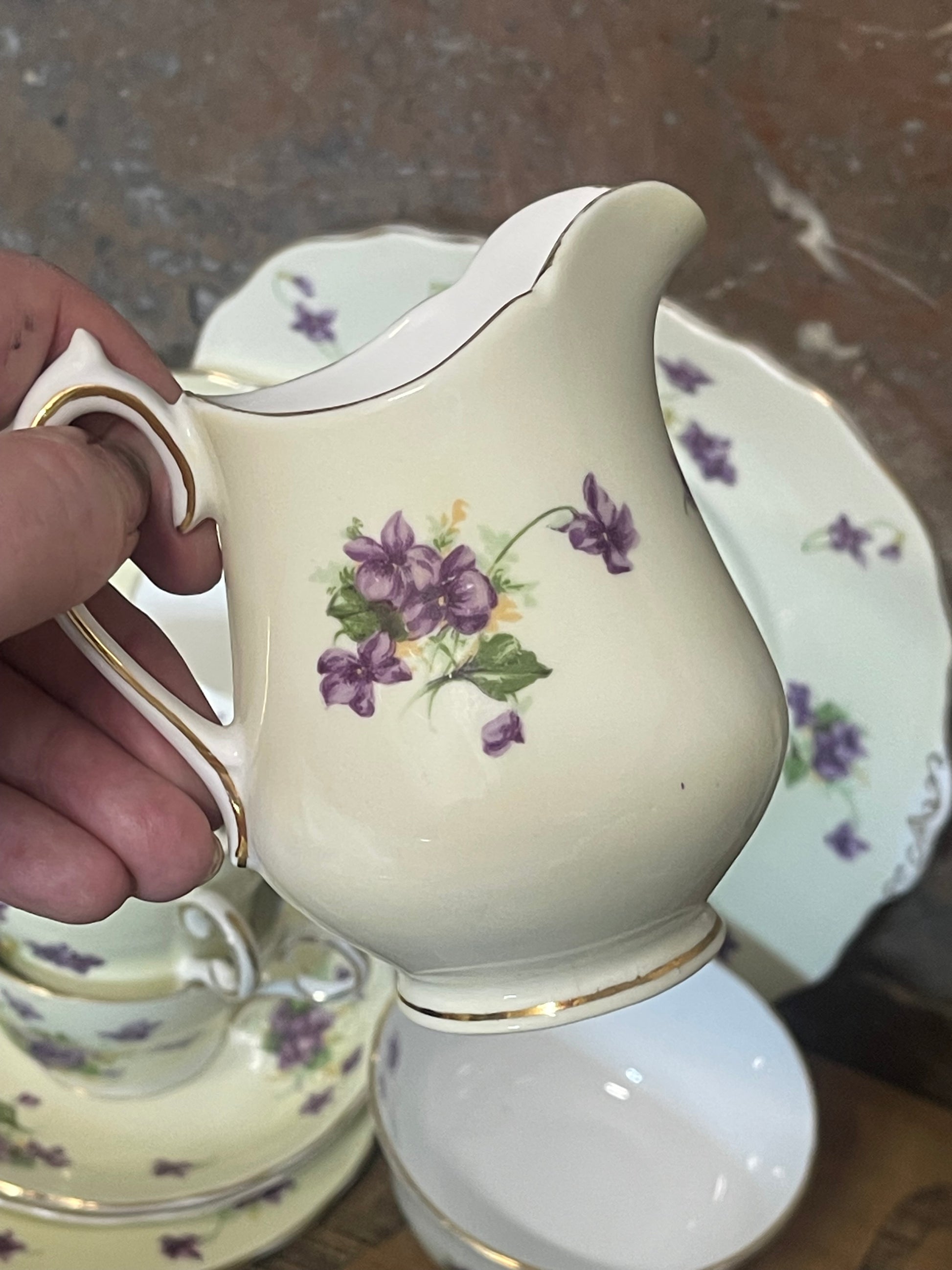 Bring a touch of English charm to your table with this pretty violet teaset by Melba Bone China, England. Decorated with sprays of deep purple violets and finished with gilt edging, this set captures the delicate elegance of mid-century floral china.