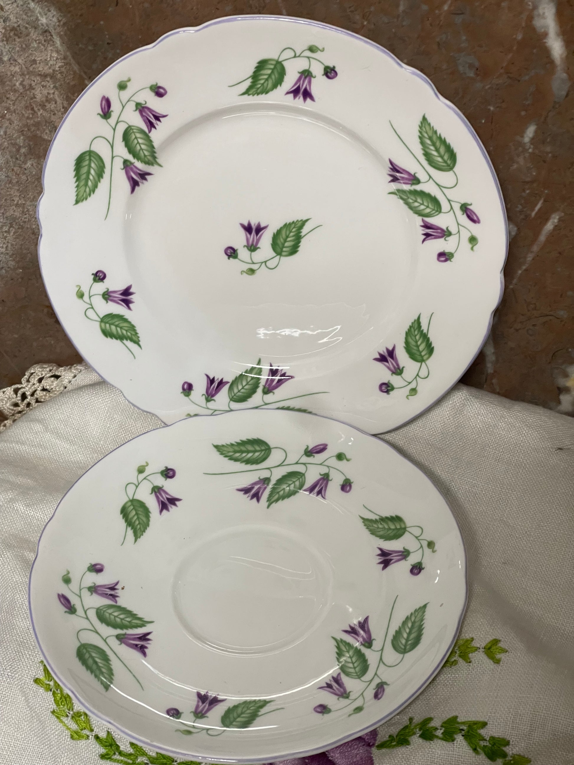 A beautiful Shelley fine bone china trio comprising cup, saucer, and tea plate in the delicate Campanulapattern. Decorated with trailing purple bellflowers and green foliage, accented with a soft lavender handle and rim trim, this set is a wonderful example of Shelley’s elegant mid-century designs.