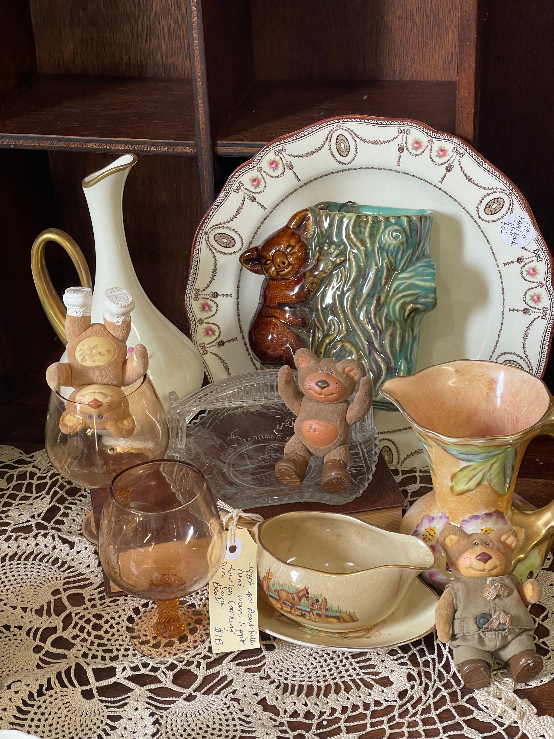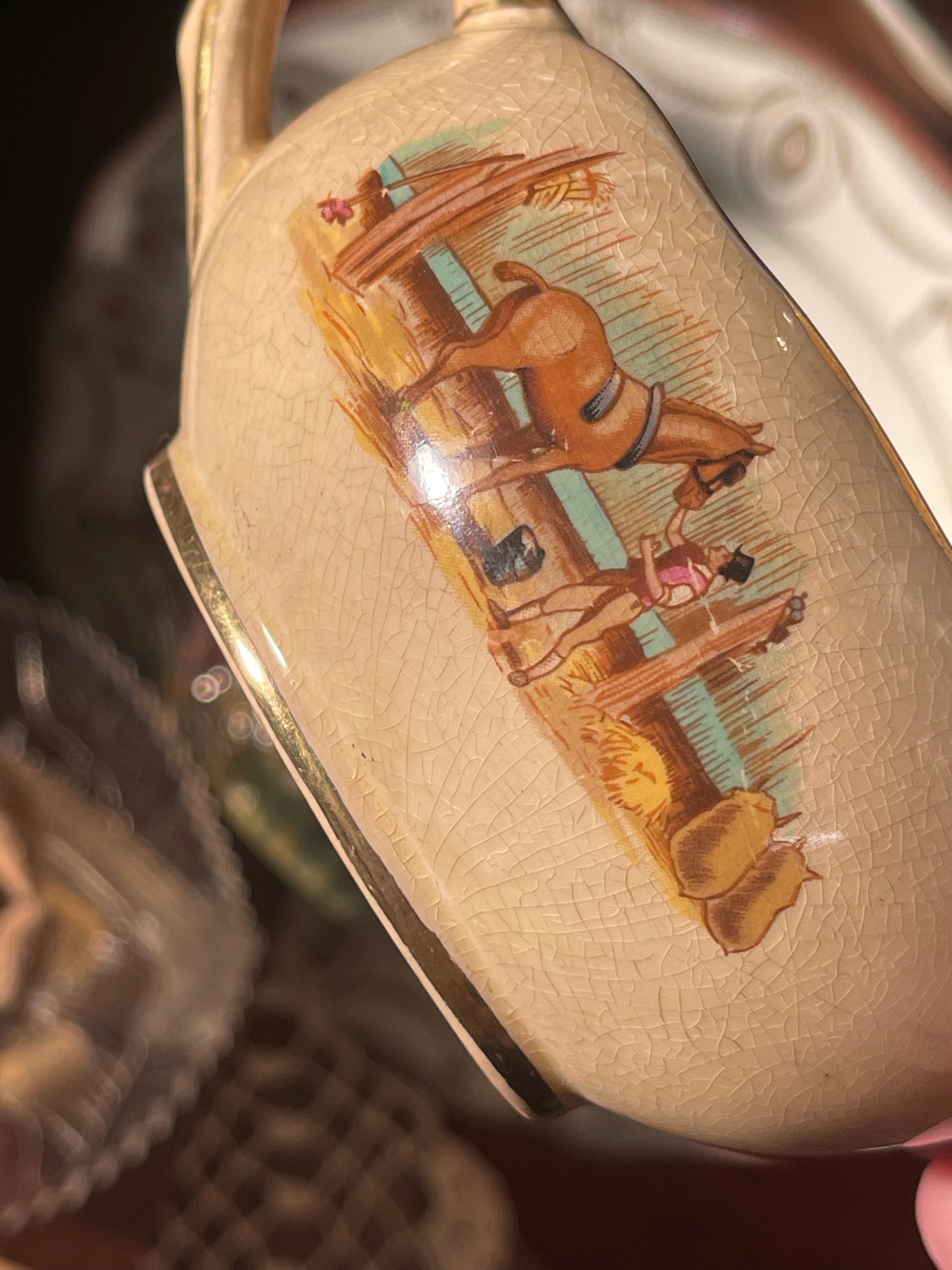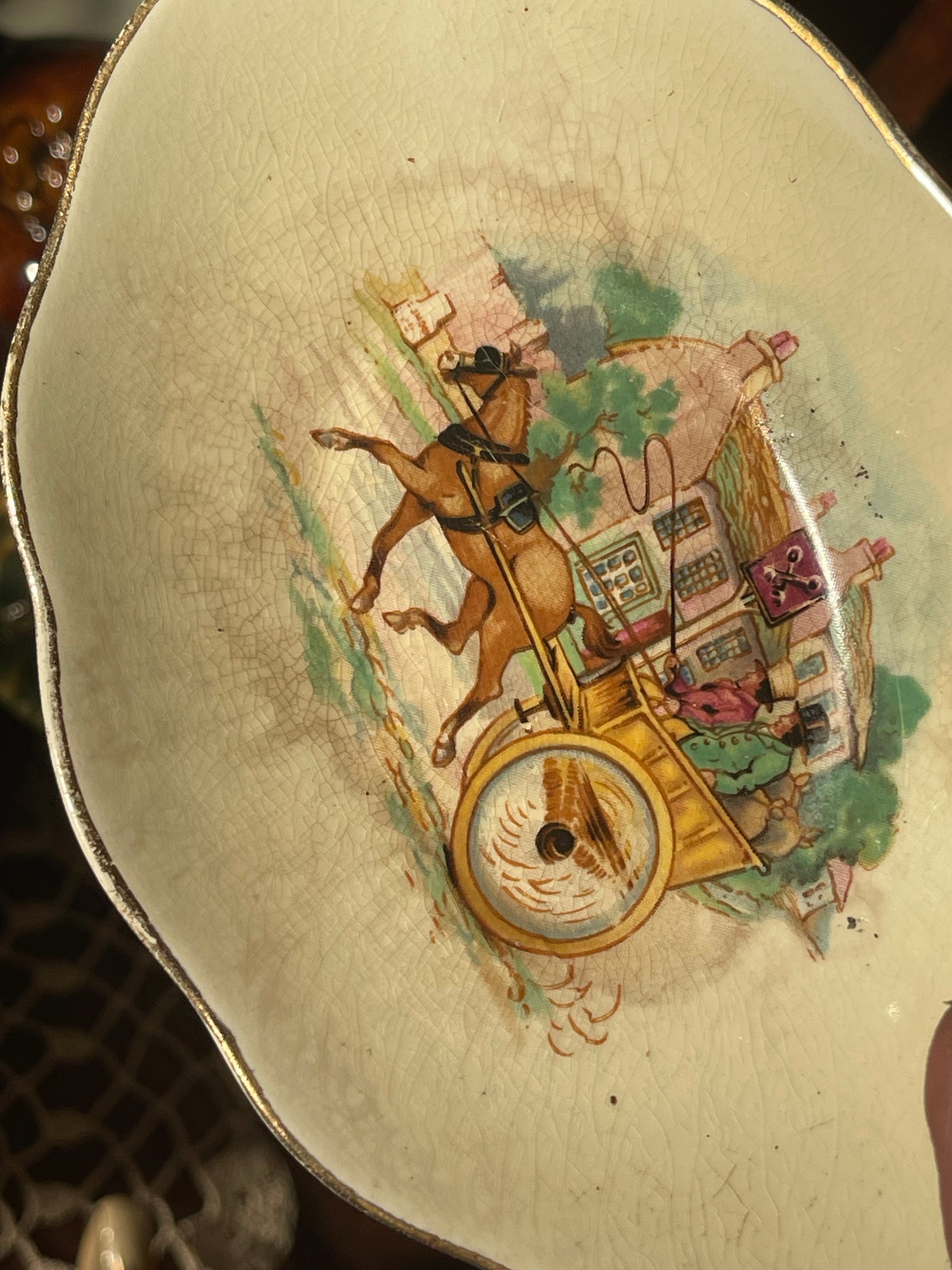 There’s something so comforting about these old pastoral scenes — horses, hay, the soft golden glaze. It feels like a painting you can hold in your hands. A sweet little piece for the dresser, the table, or tucked on a kitchen shelf.