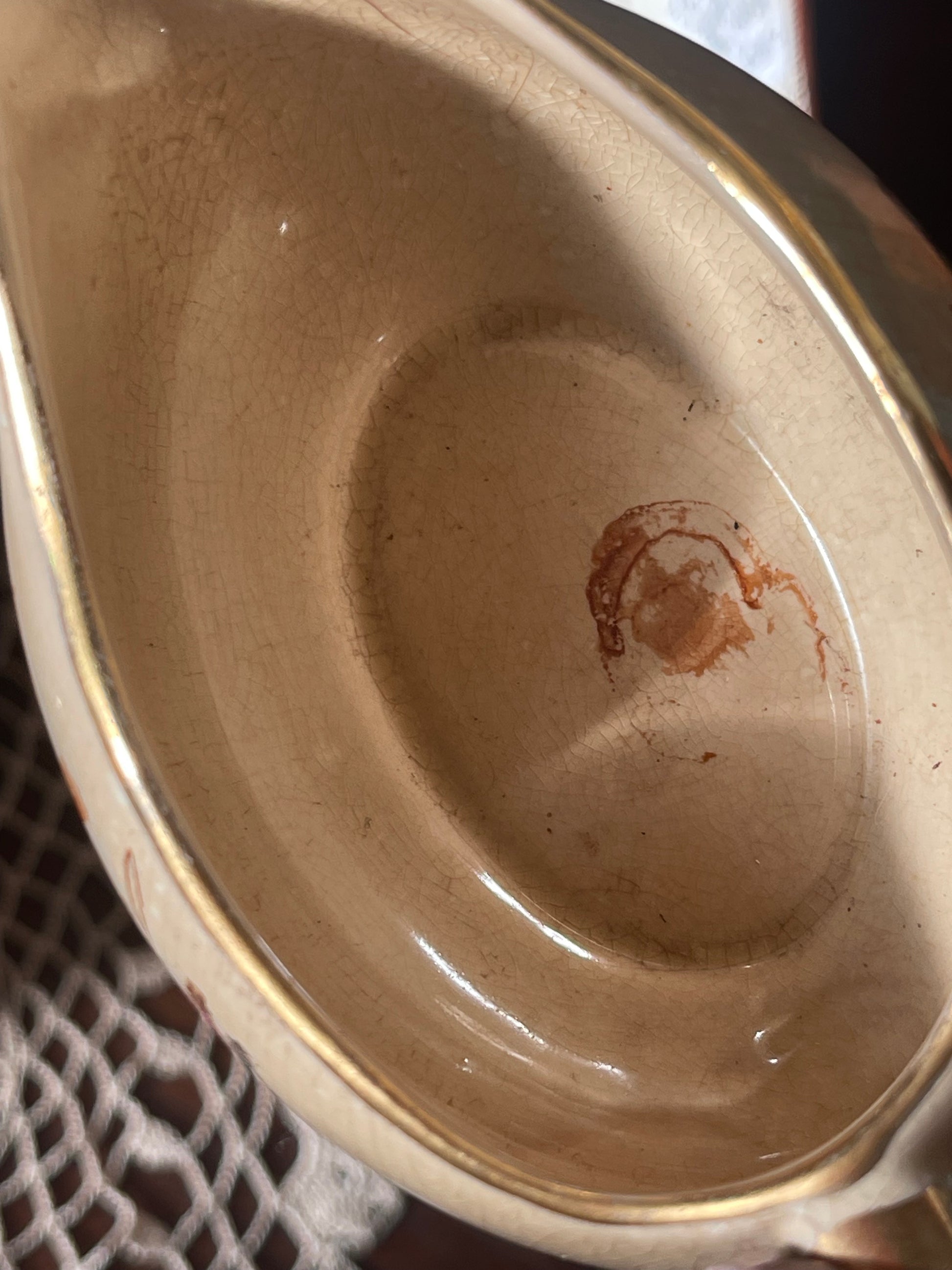 The set includes both the gravy boat and its matching underplate, with the original gilding still looking lovely. Some age toning and staining to the interior (as shown), but structurally good and still displays beautifully.