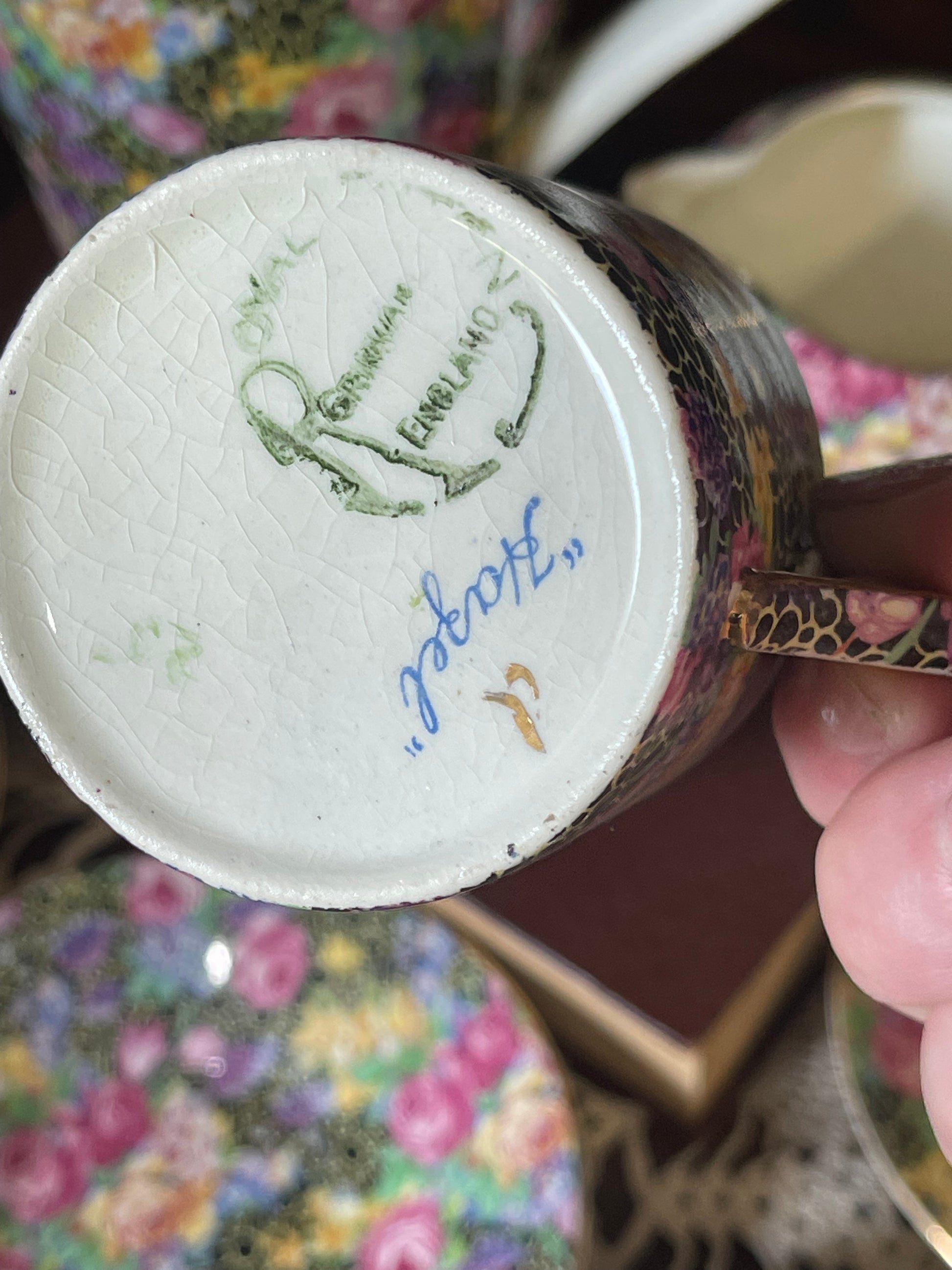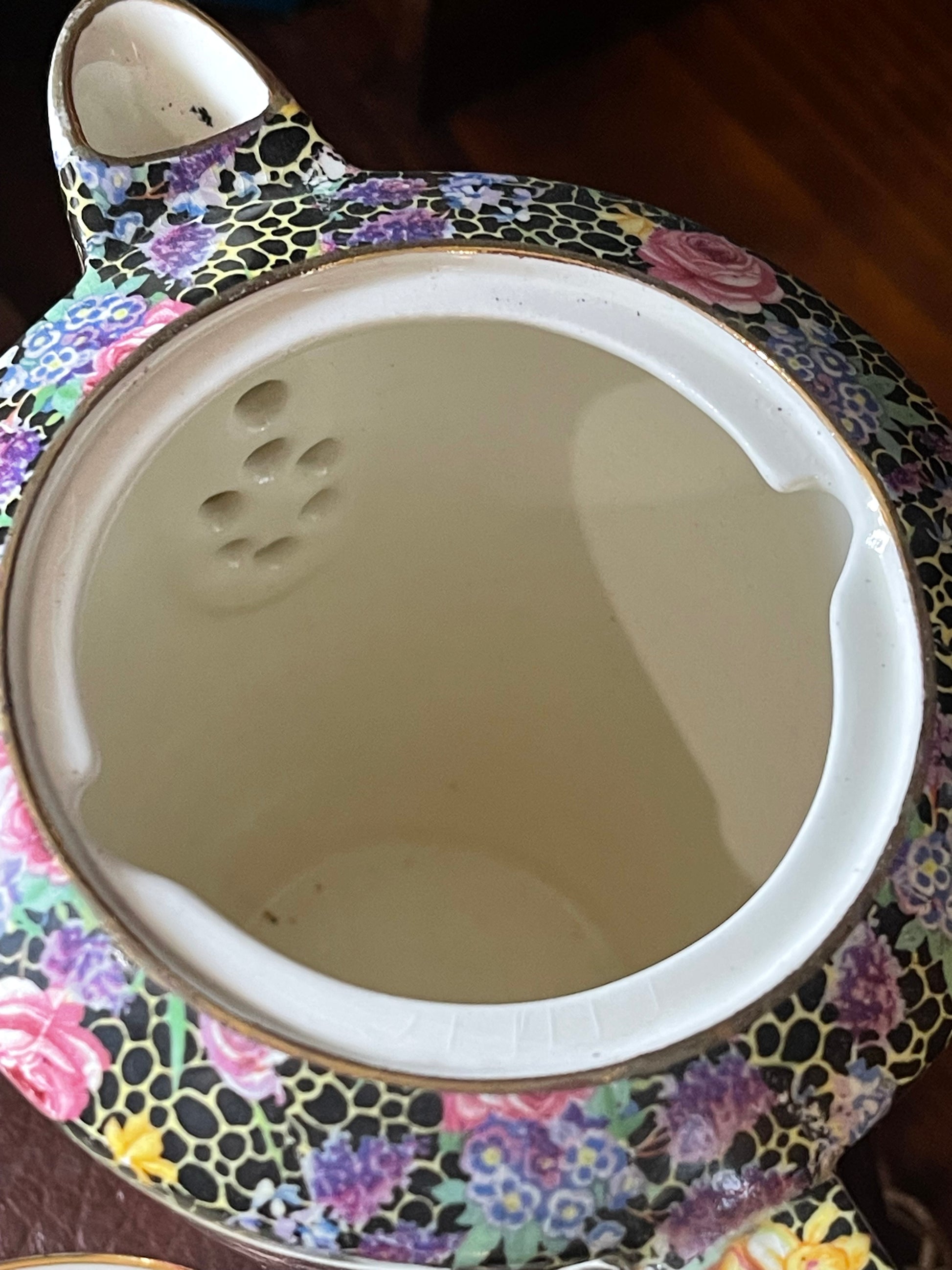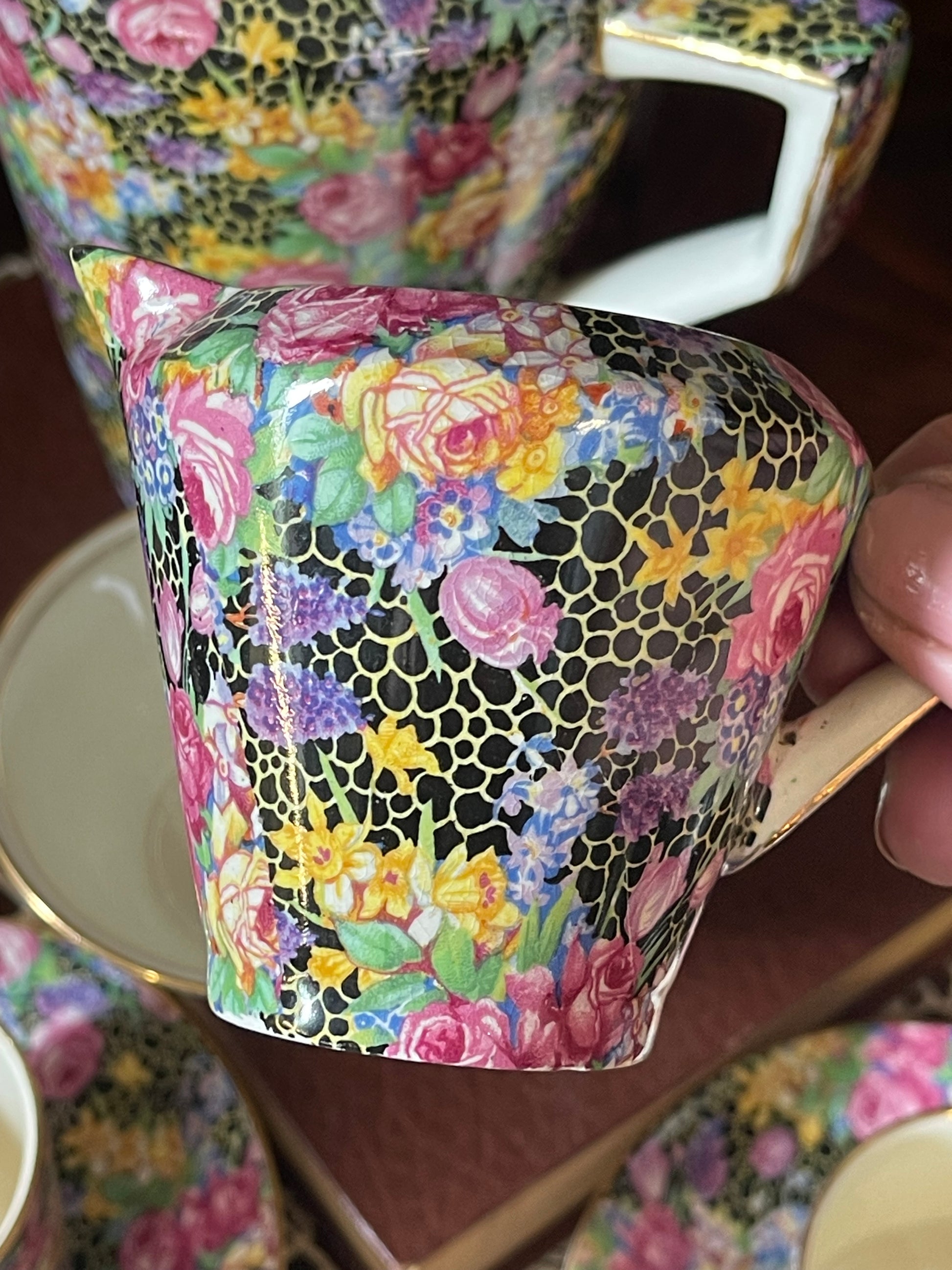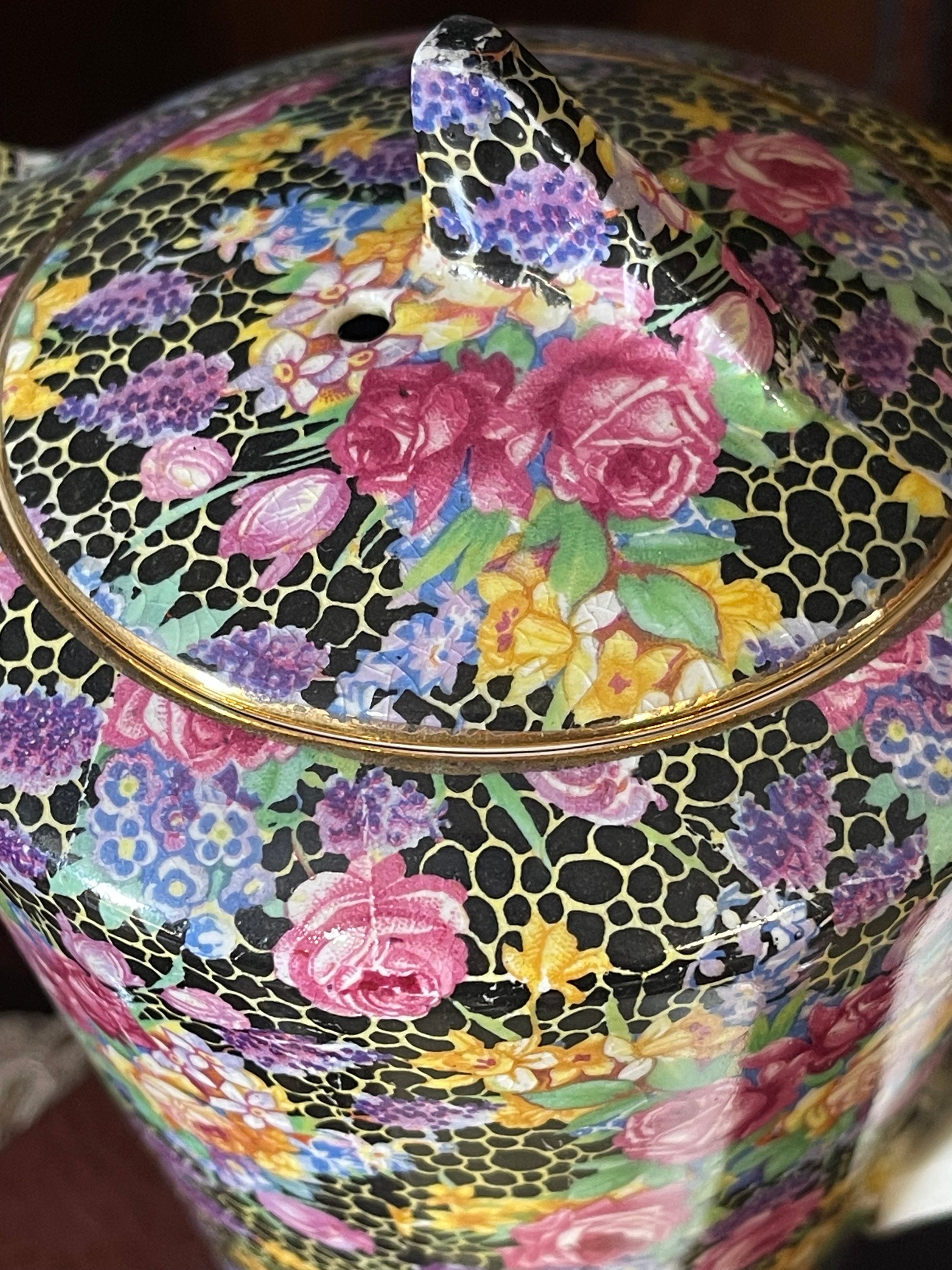 The Hazel pattern is one of Royal Winton’s most radiant and collectible chintzes: a dense garden of roses, violets, and primroses over a honeycomb-lace black ground, highlighted with hand-gilded rims. The geometric handle and angular spout lend a distinctly Deco flair, bridging floral romance and modern form.
