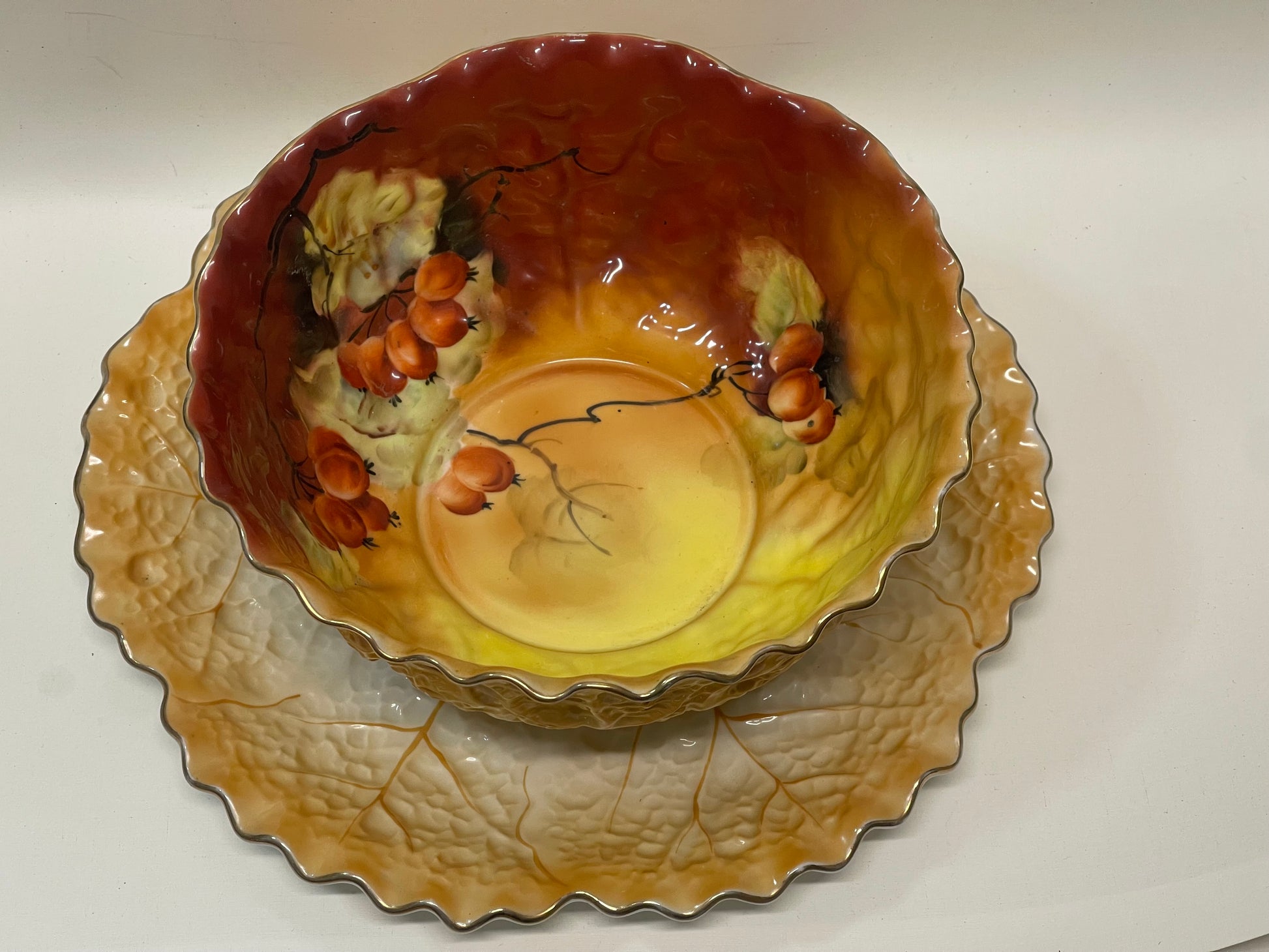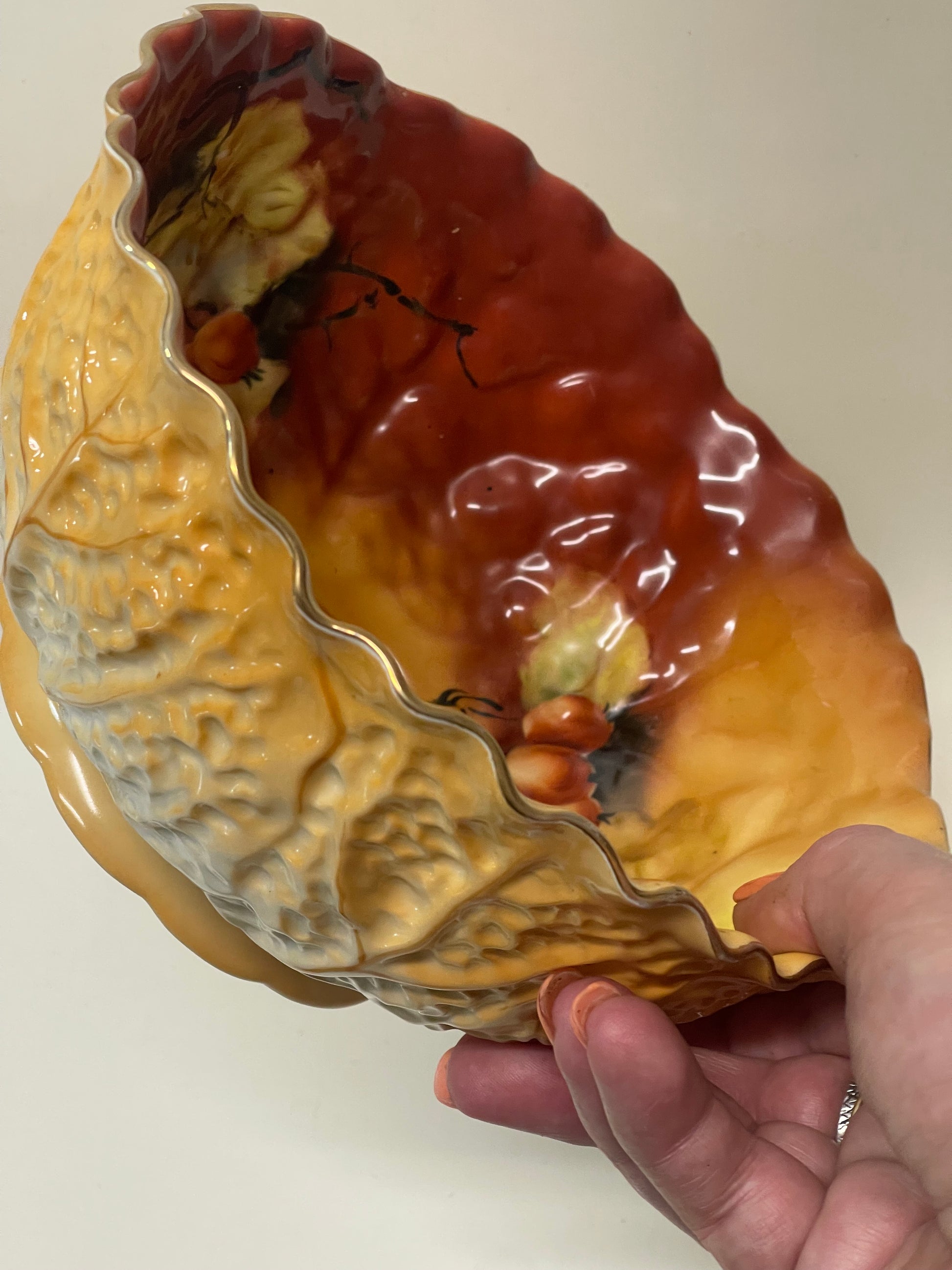 A striking 1930s Noritake salad set in the highly collectible cabbage leaf design. This set includes a large amber-glazed salad bowl, matching underplate, and coordinating serving utensils. The interior of the bowl is beautifully hand-painted with autumn fruit, showcasing Noritake’s renowned craftsmanship of the era.