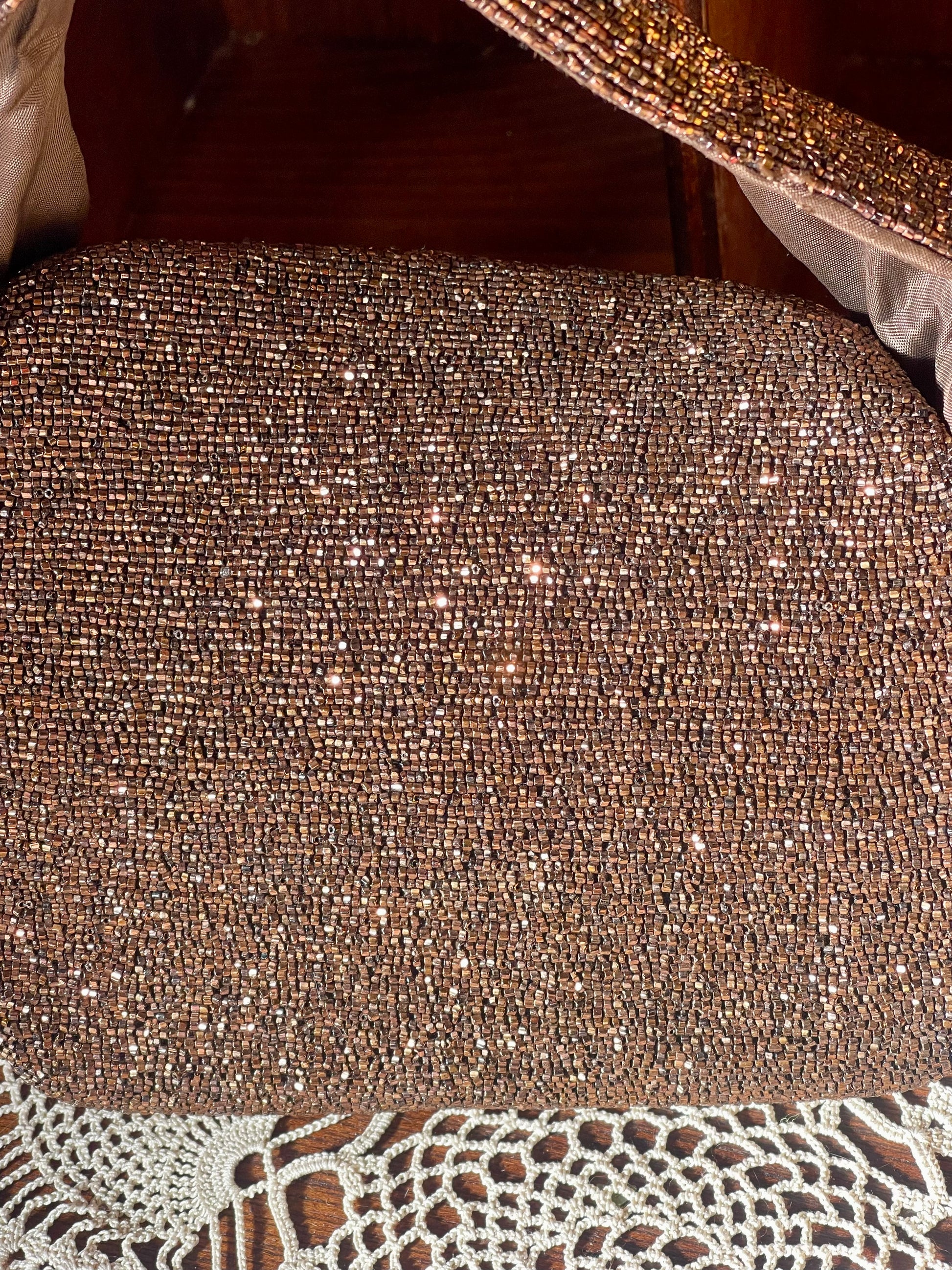 Elegant 1950s French beaded evening bag, hand-crafted in shimmering bronze glass beads. The rounded body and wide, structured handle give it a glamorous silhouette — made for candlelight, theatre nights, and whispered goodbyes at the taxi rank.