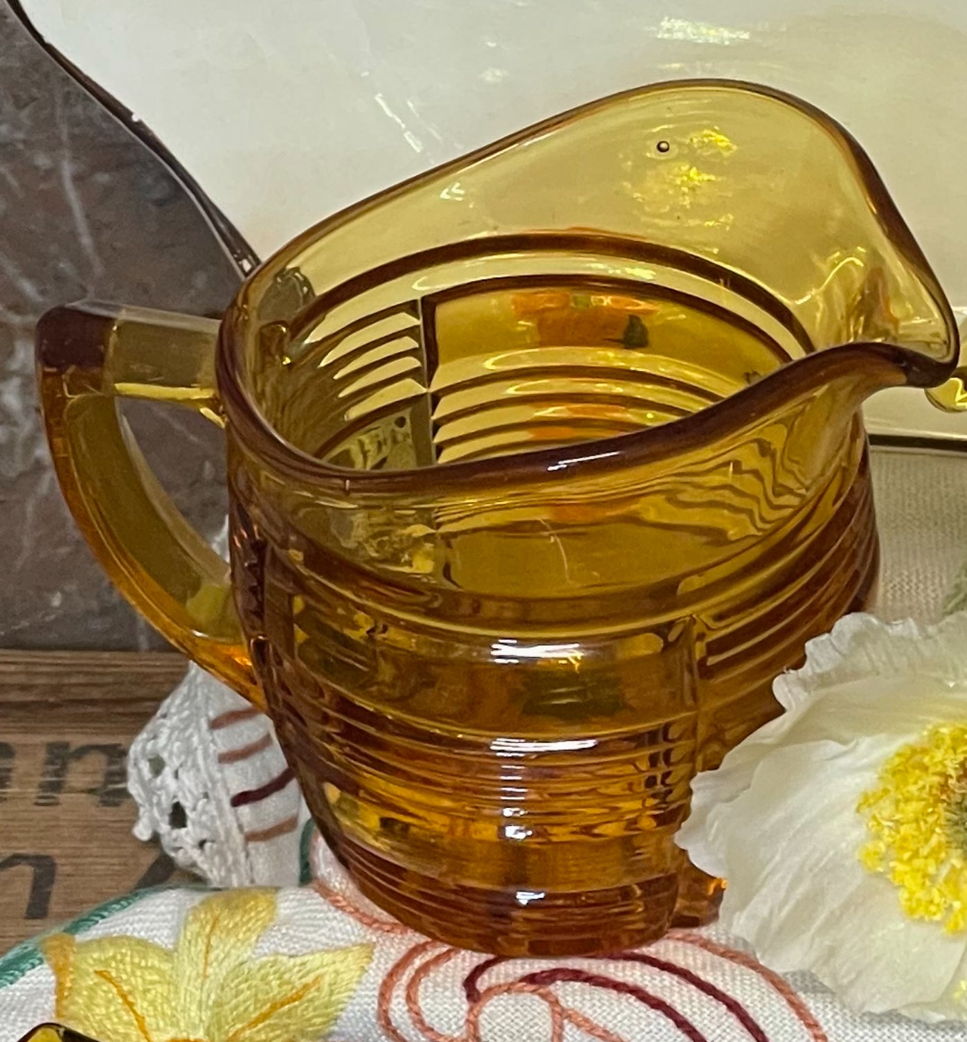 The warm amber glass adds a golden glow to any table, catching the light beautifully. Its sturdy handle and spout make it practical as well as stylish, a fine example of mid-century pressed glassware.