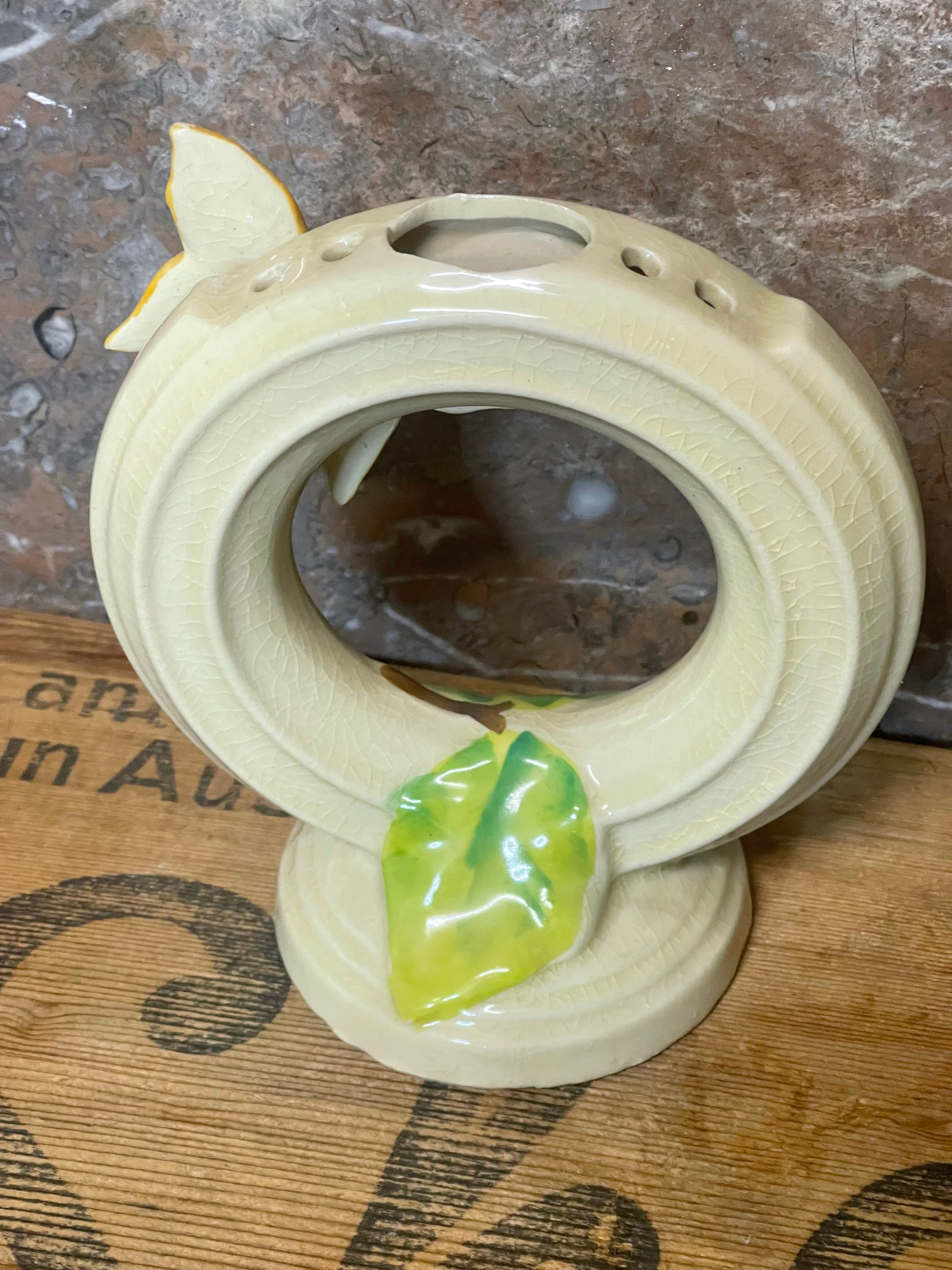 A charming vintage ceramic posy vase featuring a sculptural butterfly perched on the rim with hand-painted details in bright yellow, orange, and green. The circular form includes pierced openings, perfect for arranging small flower stems. Finished with a cream crackle glaze and leafy base, this piece is full of retro character and cottage-style charm.