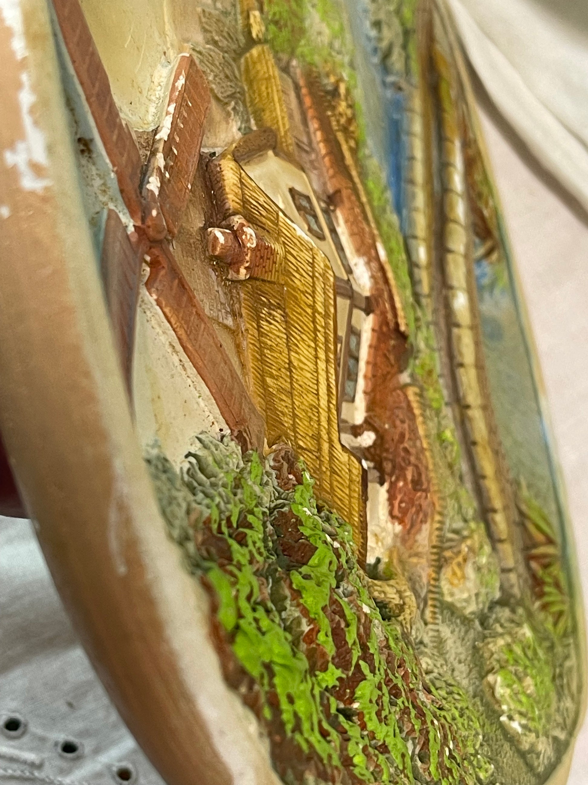 A charming mid-century chalkware wall plaque featuring a pastoral English countryside scene — complete with windmill, thatched cottage, stone bridge and flowing stream.