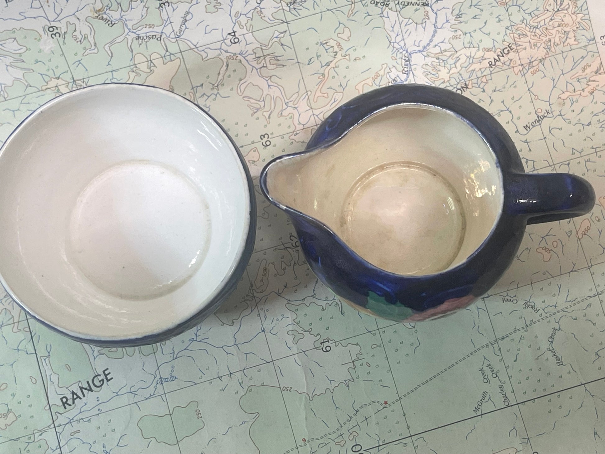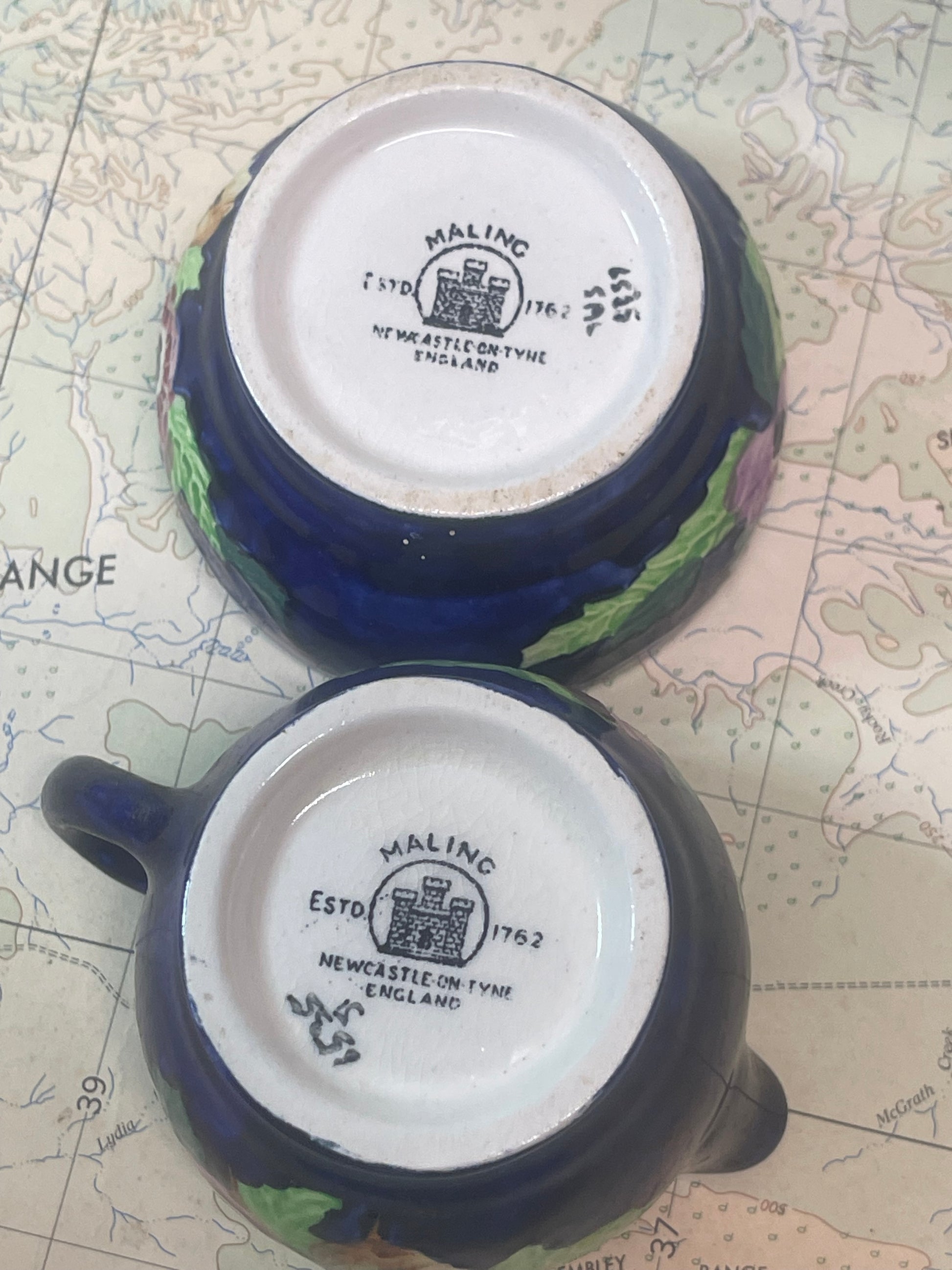 A rich and characterful vintage sugar bowl and creamer set by Maling, Newcastle upon Tyne — also commonly known as Maling Ware.