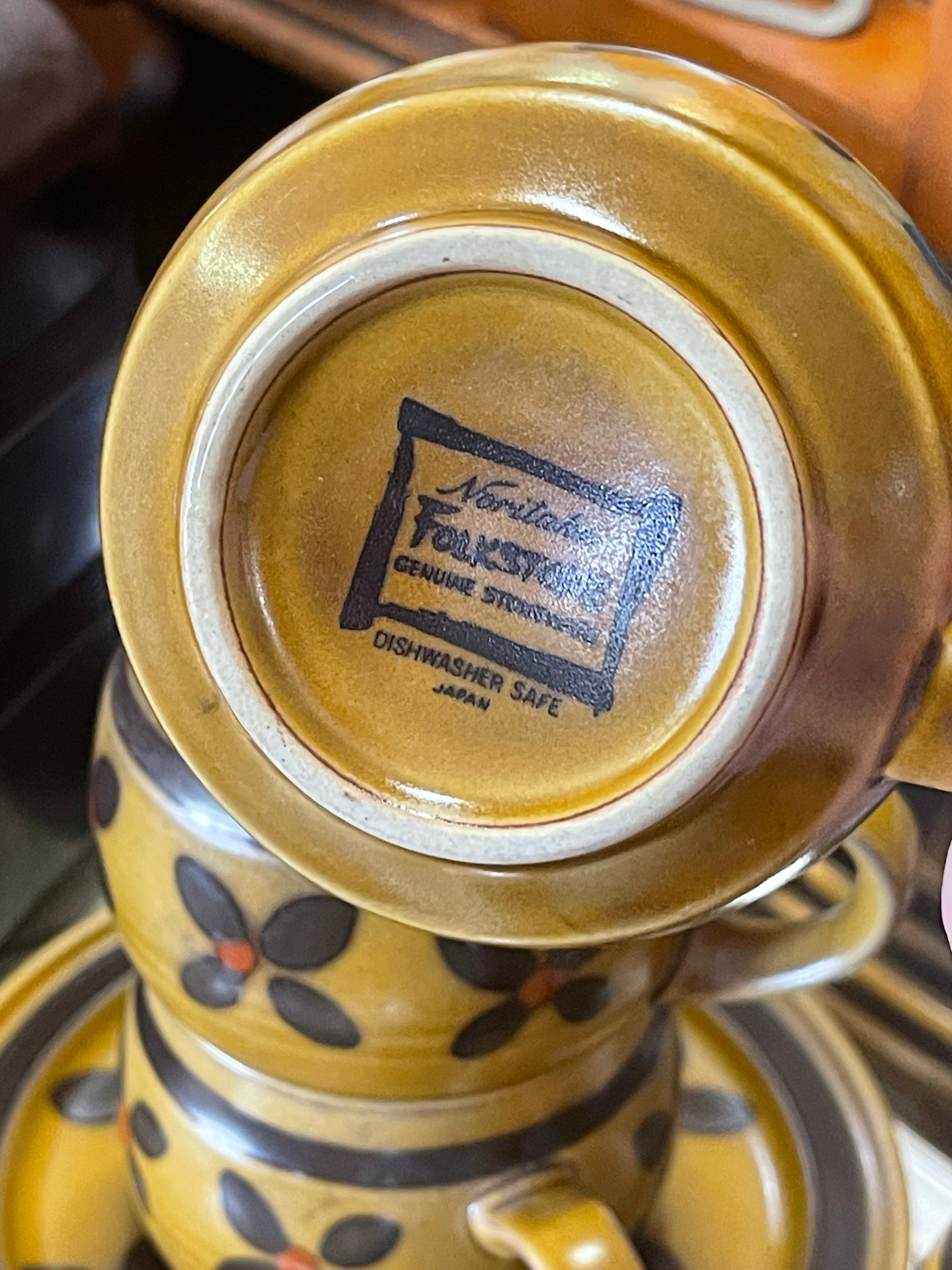 A beautiful 1970s Noritake “Flower Time” stoneware coffee set from Japan, featuring the warm mustard glaze and hand-painted brown and orange blossom motif that made this line a retro favourite. Each piece is trimmed with a deep chocolate rim and finished with Noritake’s durable, genuine stoneware glaze.